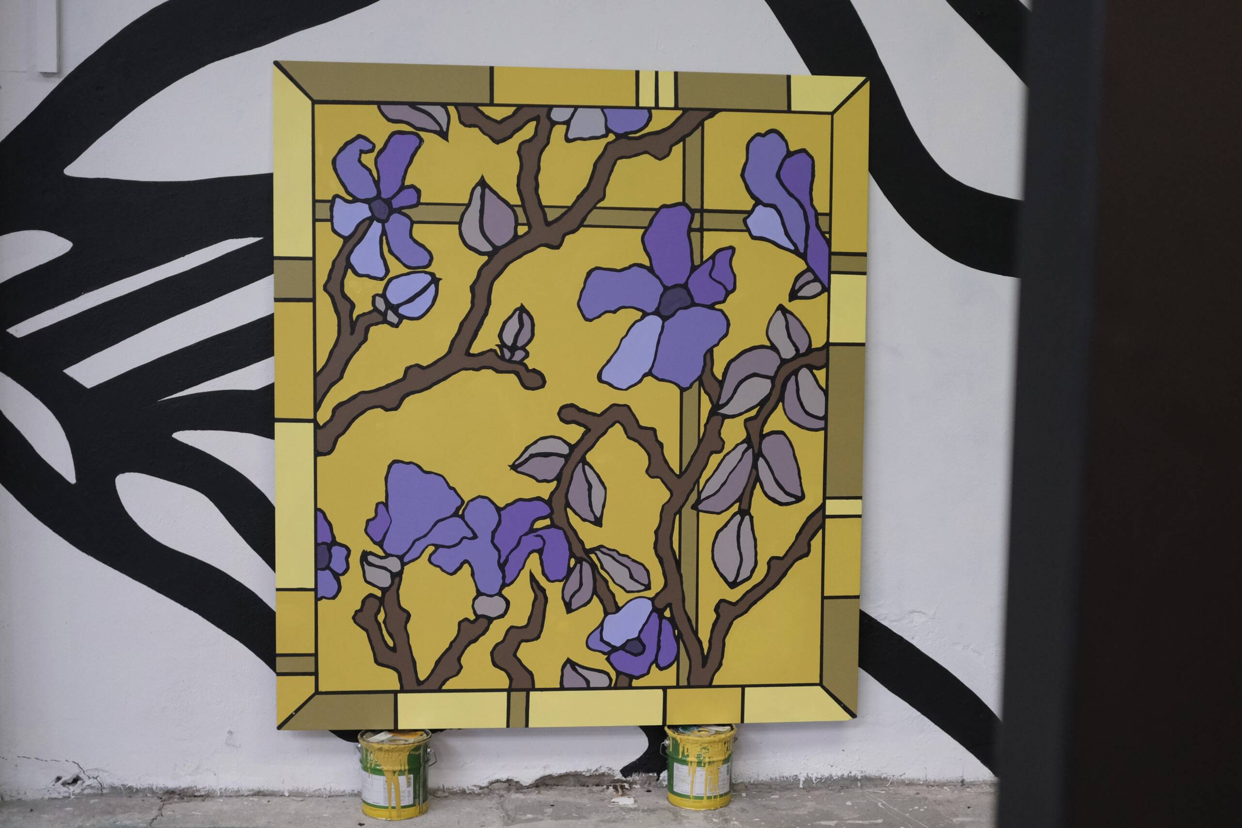 Depuis son arrivée en janvier, Louisa a mené une exploration artistique autour de la thématique du vitrail. Inspirée librement du travail emblématique d’Alphonse Mucha, figure de proue de l’Art Nouveau, elle transpose ses lignes et ses motifs dans un contexte d’art urbain.