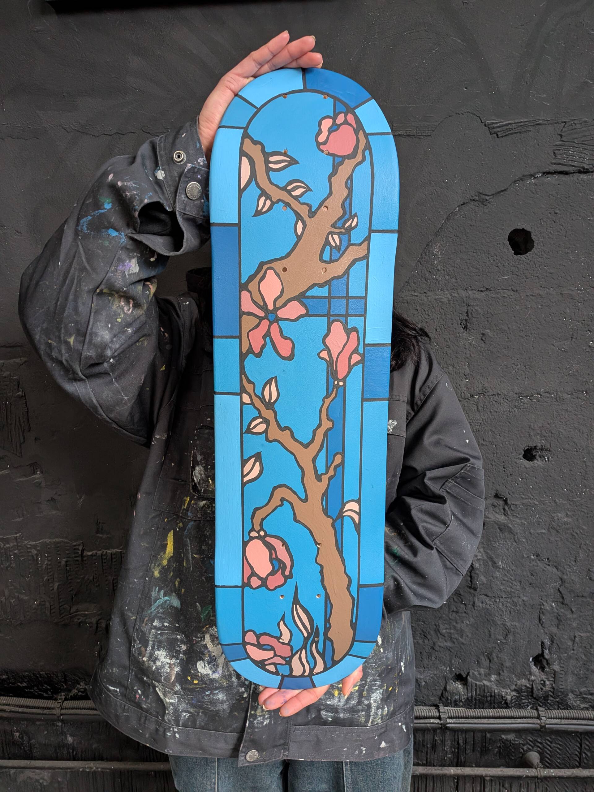 • Une planche de skateboard, peinte en écho aux deux premières œuvres, complétant cette belle série.