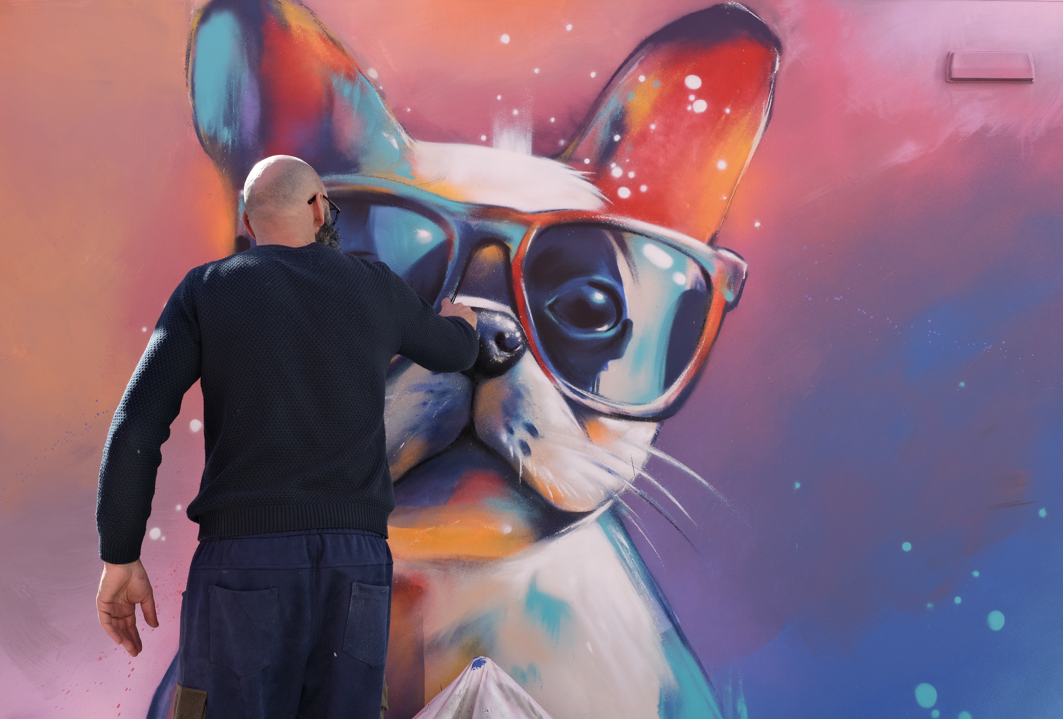De son côté, Kalouf, figure reconnue du street art, a cofondé le collectif Blast Art en 2014 avec Romain Lardanchet. Rapidement rejoints par d’autres artistes, ils développent ensemble des œuvres monumentales aux univers animaliers colorés et expressifs. Leur travail, visible dans de nombreuses villes, se distingue par des fresques monumentales qui mettent en scène la faune dans des compositions colorées. À travers cette collaboration avec Anamorphose et SoliVet, l’artiste met son talent au service d’un projet solidaire à fort impact local.