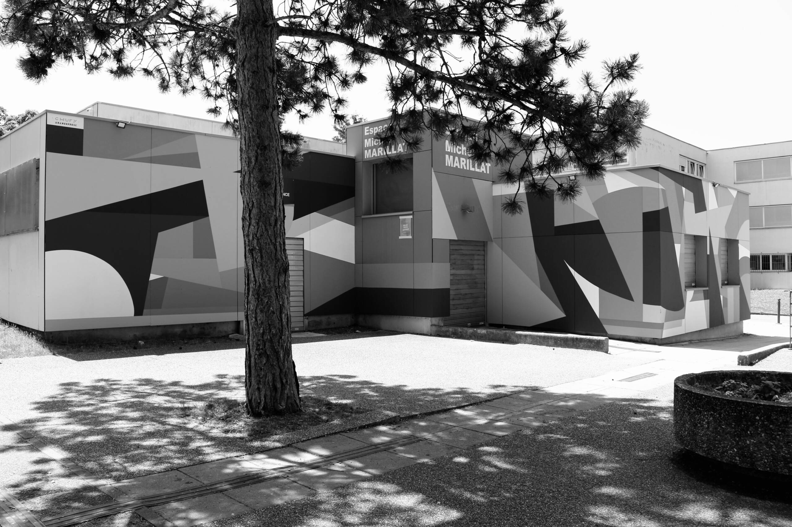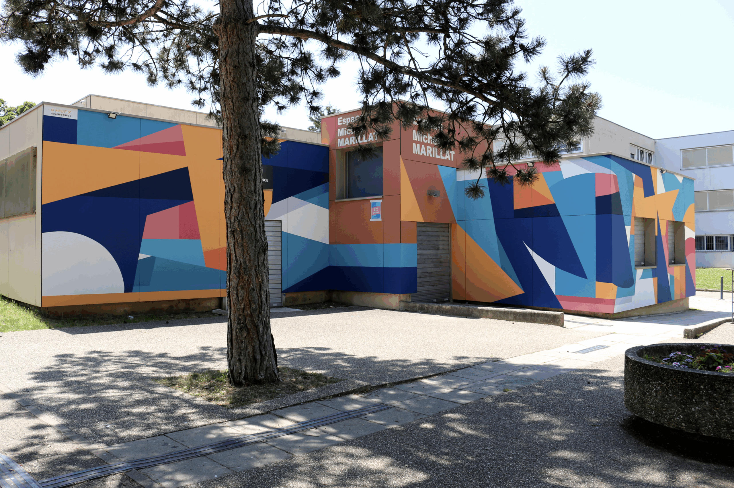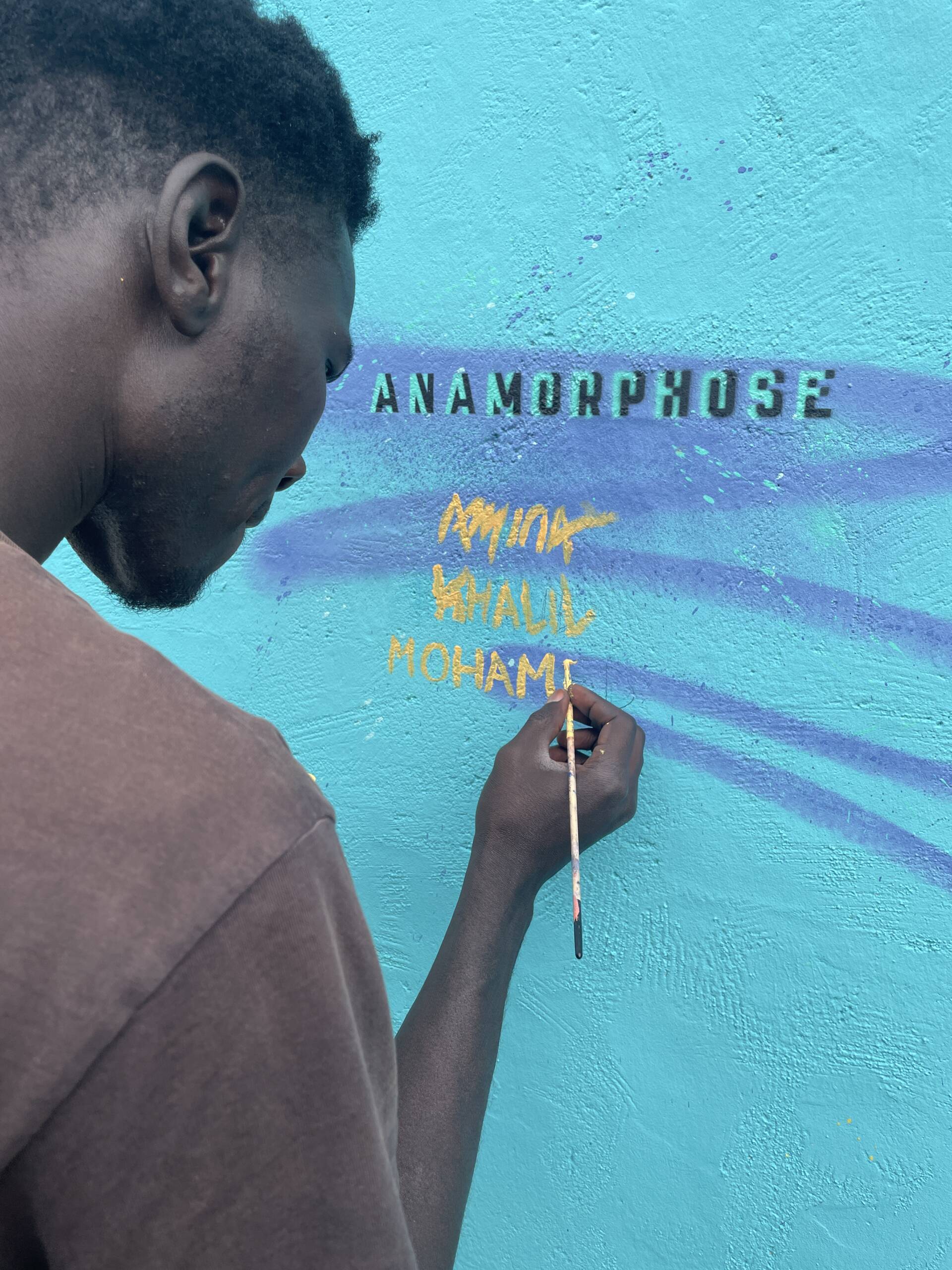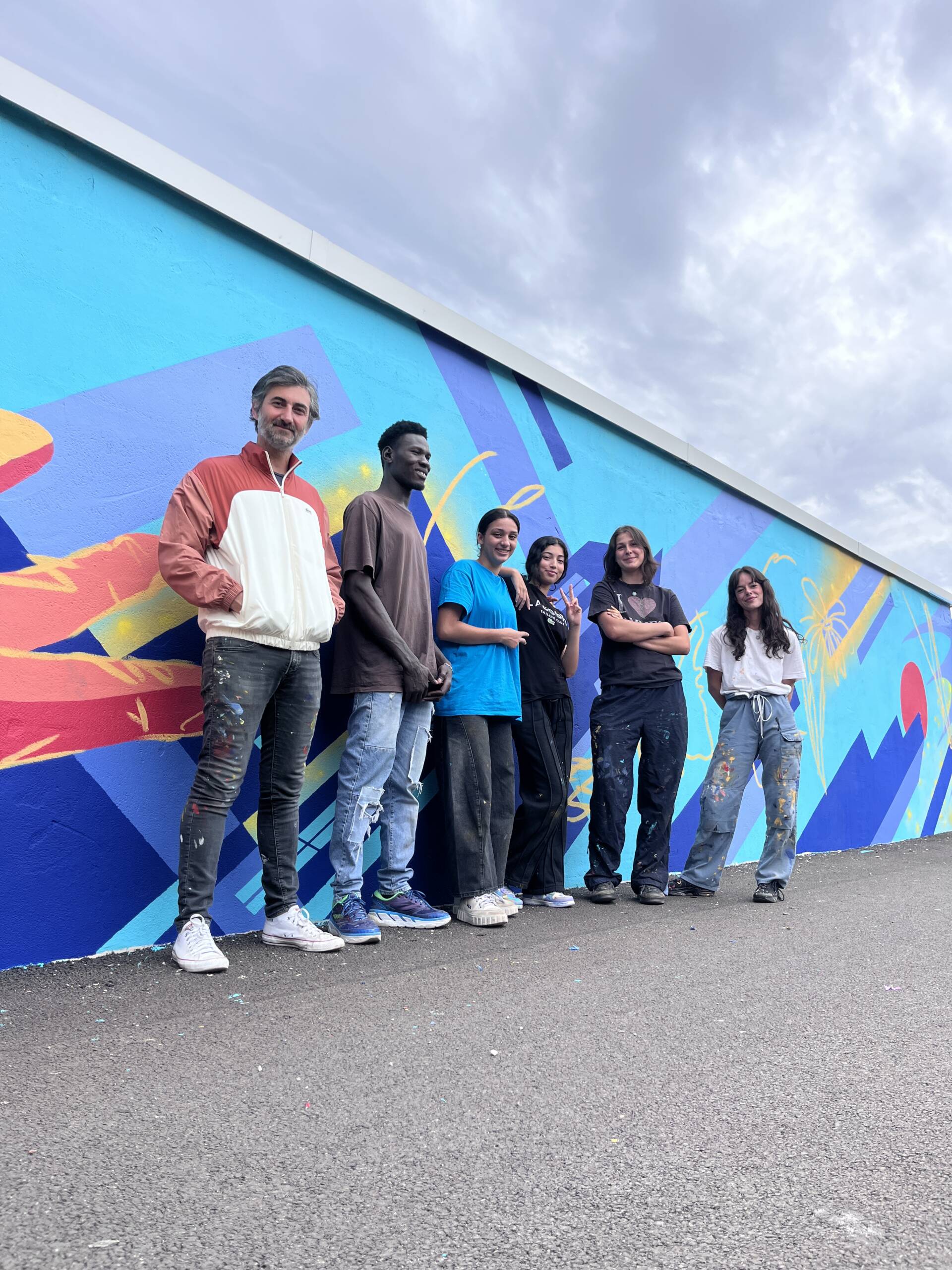 Réalisation d'une fresque par les jeunes de l'Espace Jeunes ; création 100% Anamorphose ; 100% réemploi.