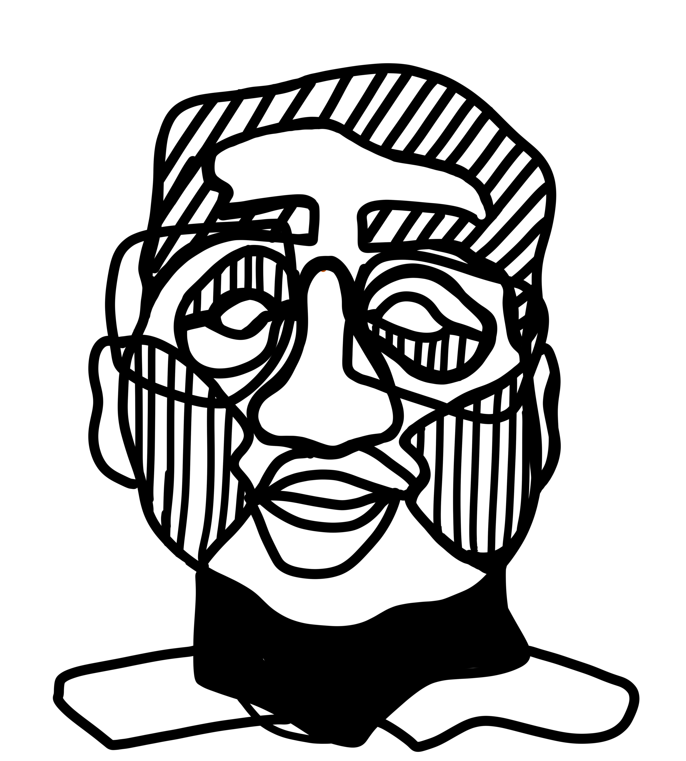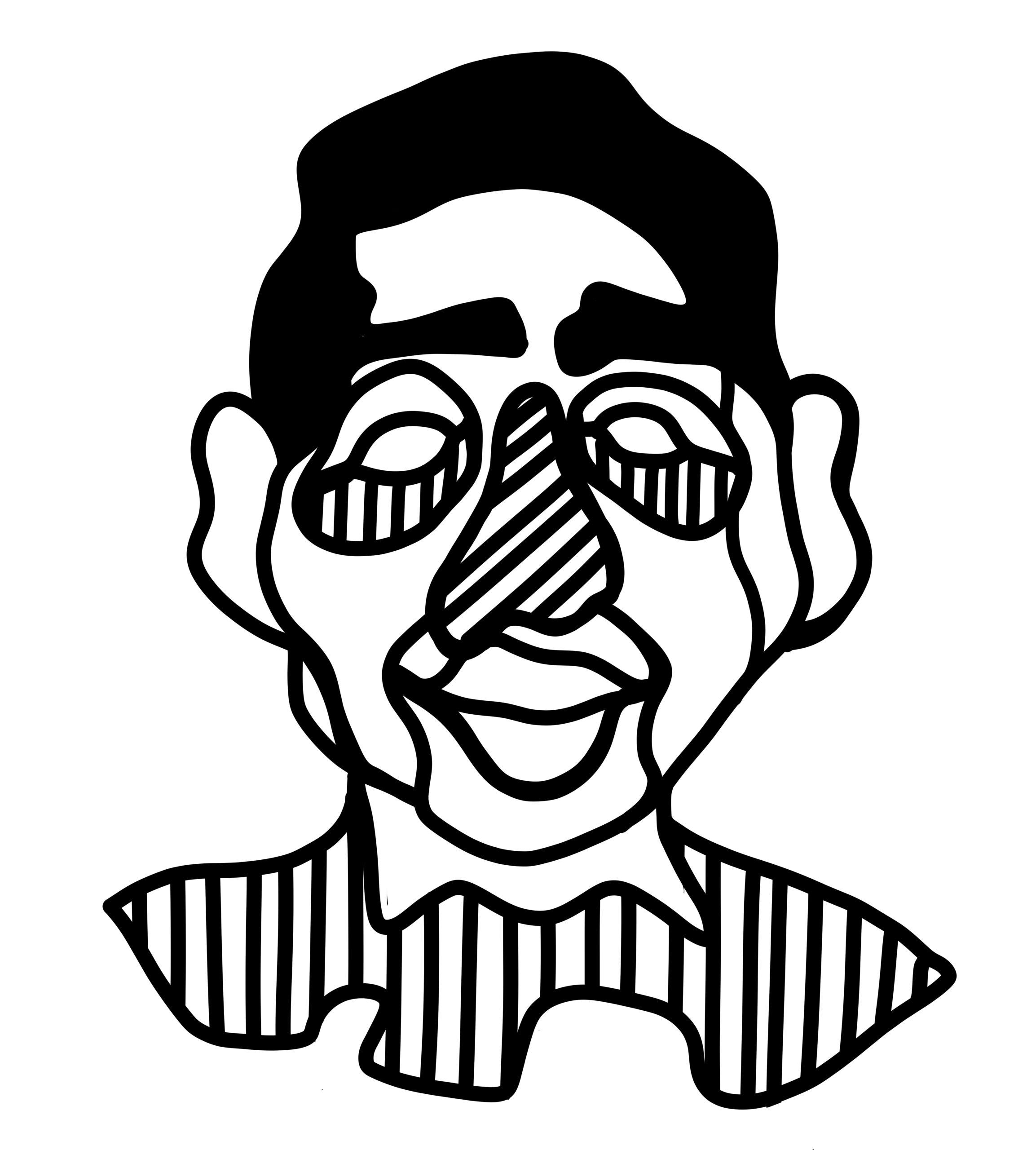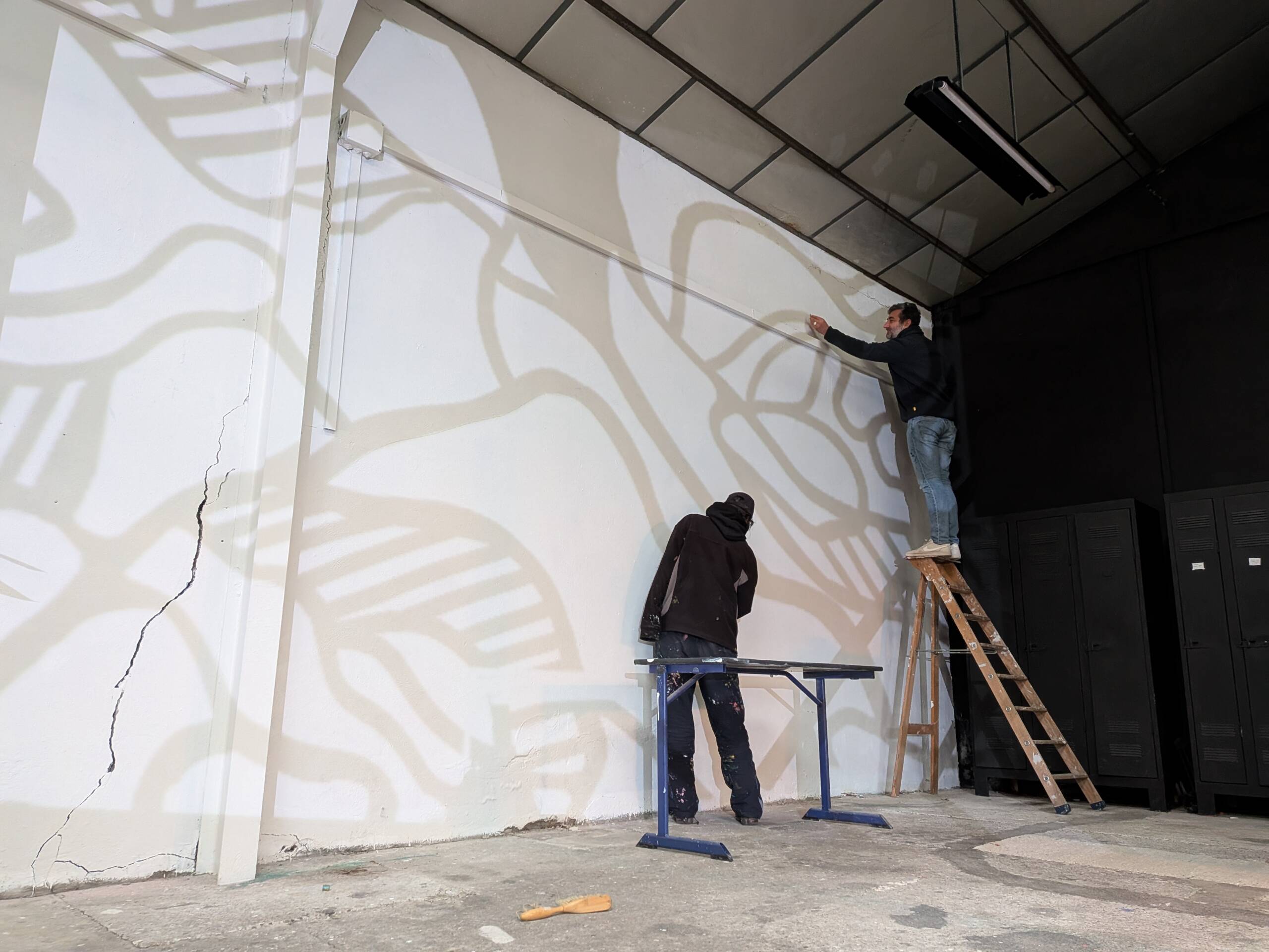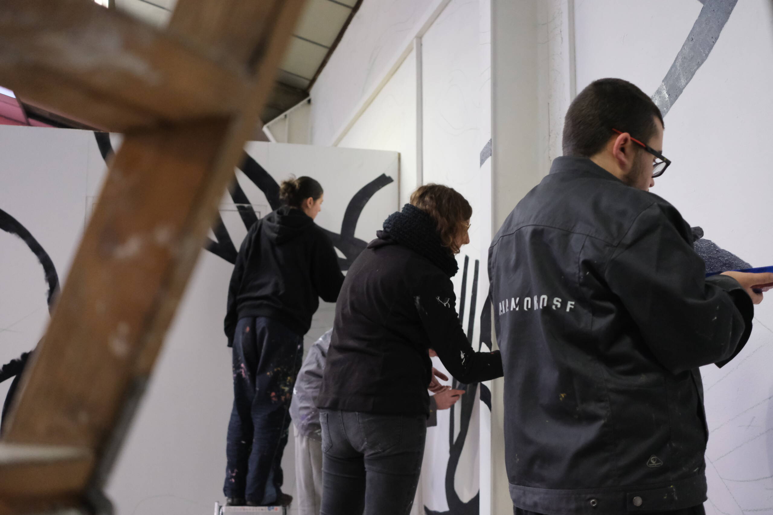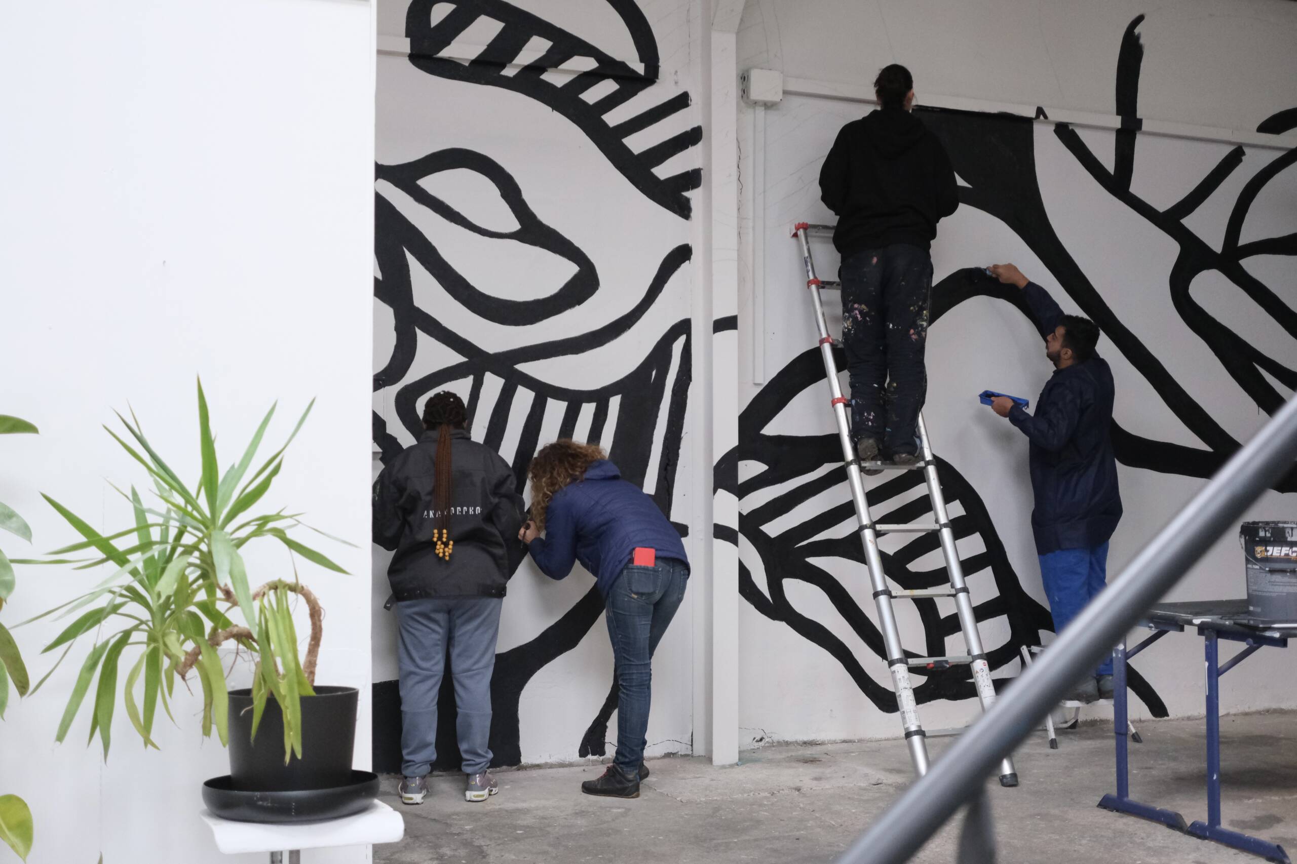 Fresque semi abstraite en noir et blanc inspirée du travail de l'artiste Dubuffet. Incrustation de portraits imaginés par Louisa et intégrés dans la composition de Chloé. Réalisée par les jeunes de la Fondation OVE avec 100% de réemploi de peinture.
