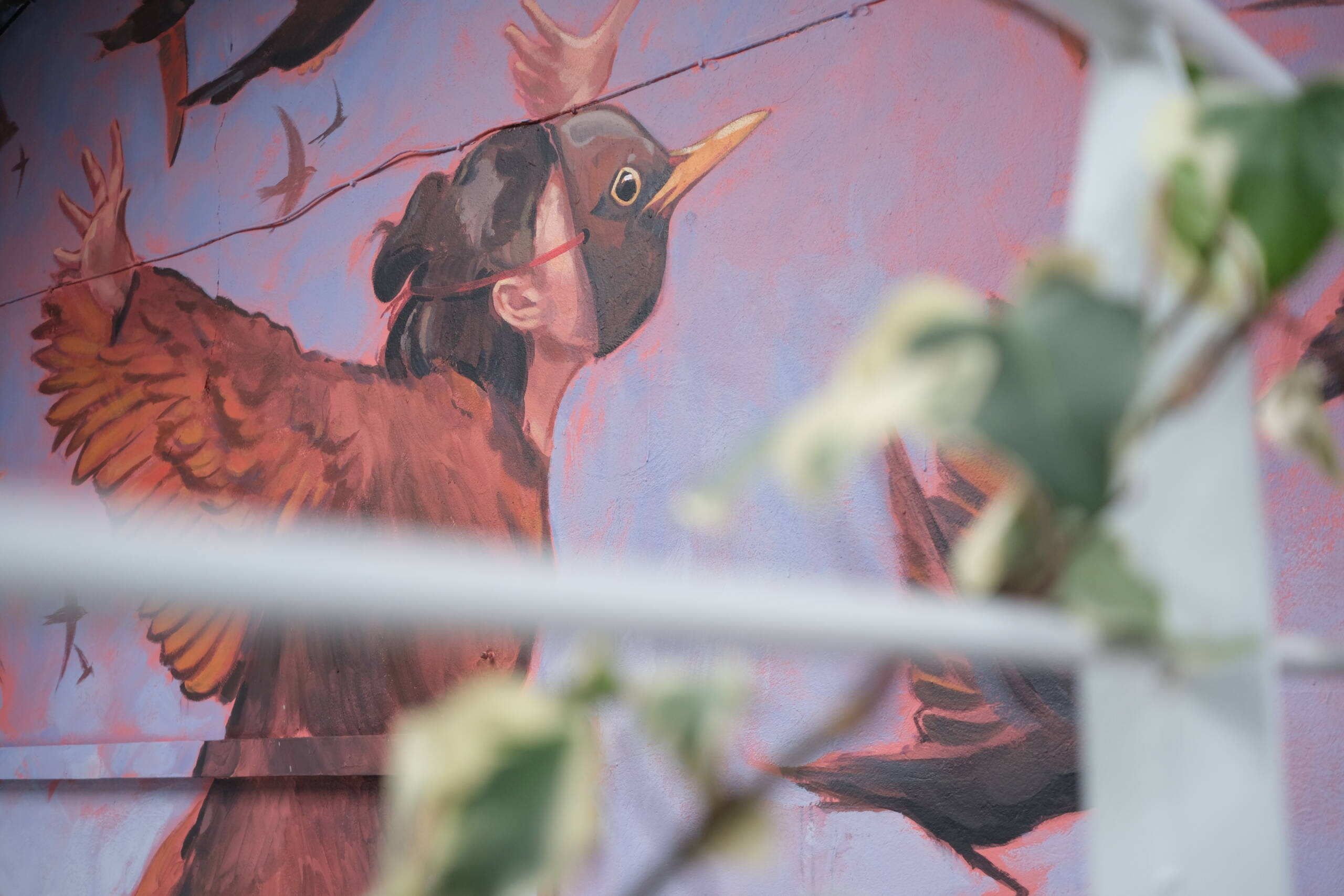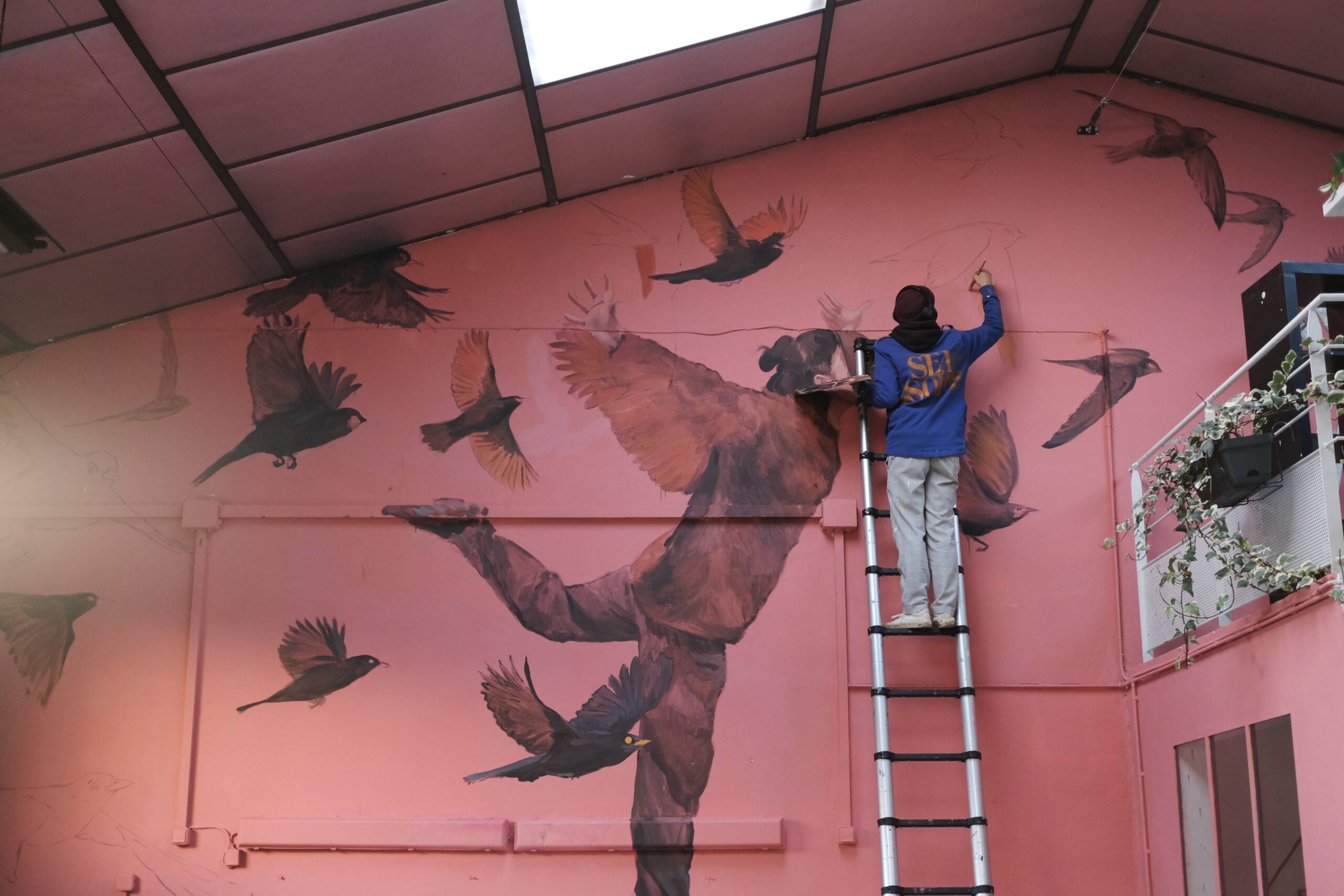Une oeuvre poétique, signée Agrume & Anamorphose, qui transforme complètement l'atelier. Elle symbolise bien l'accompagnement que nous menons chaque semaine : aider les jeunes à prendre leur envol.