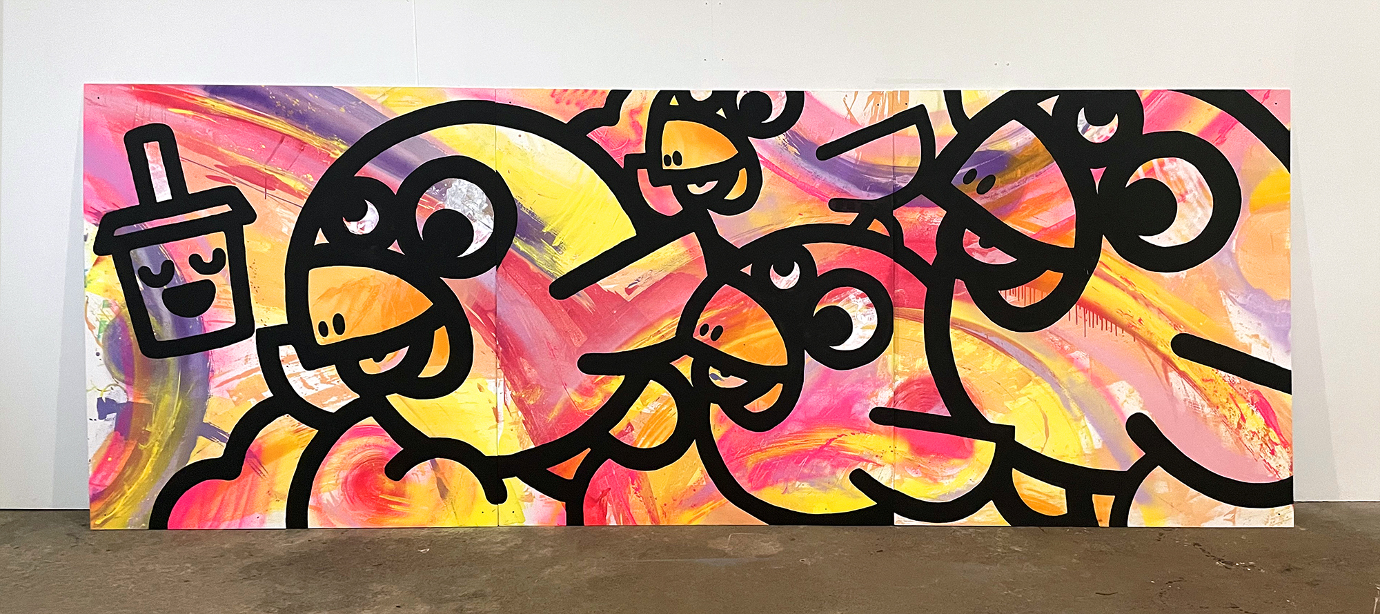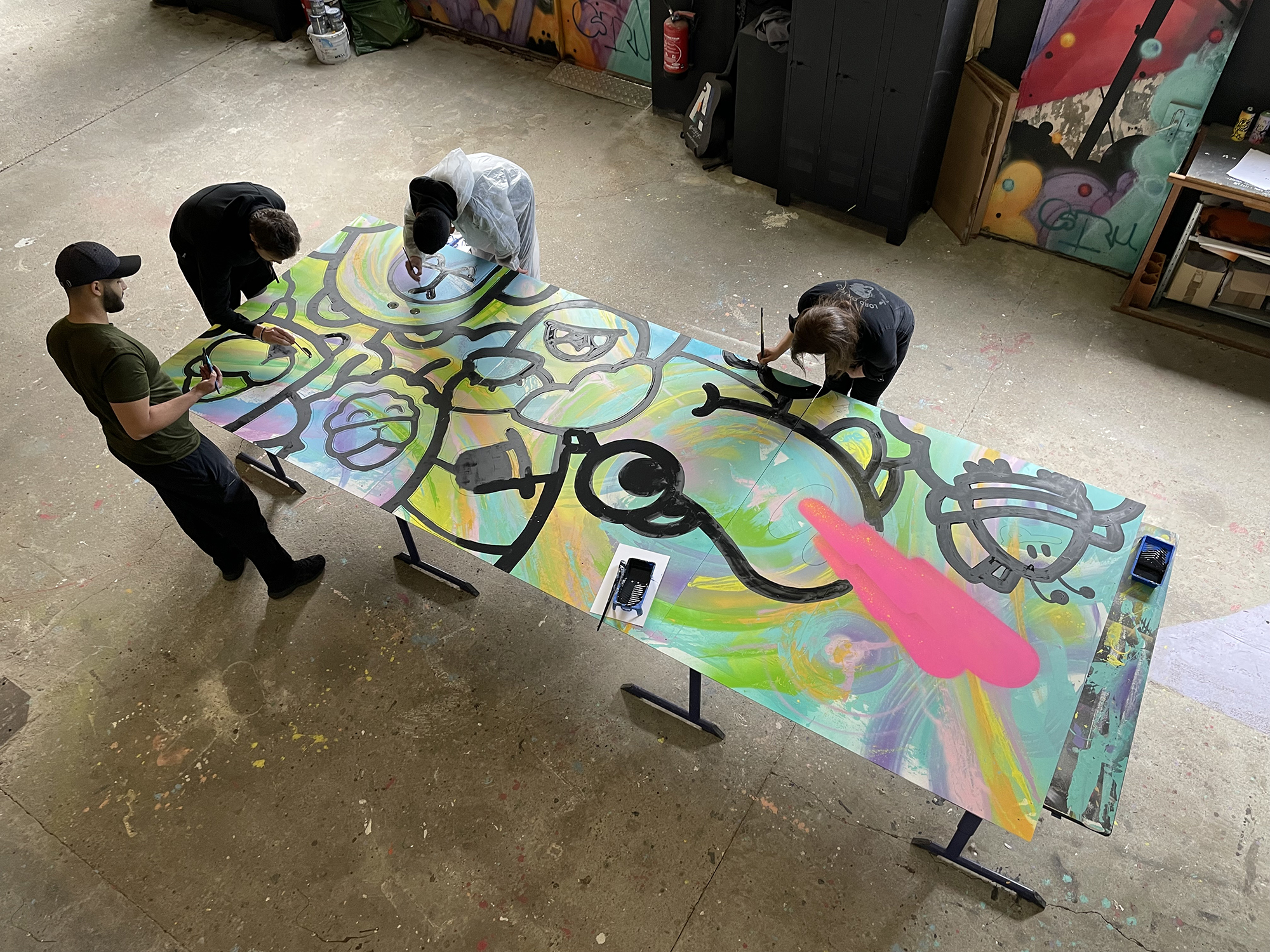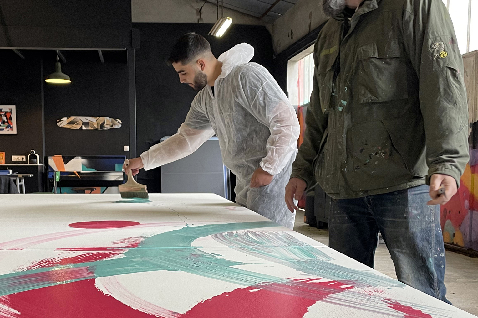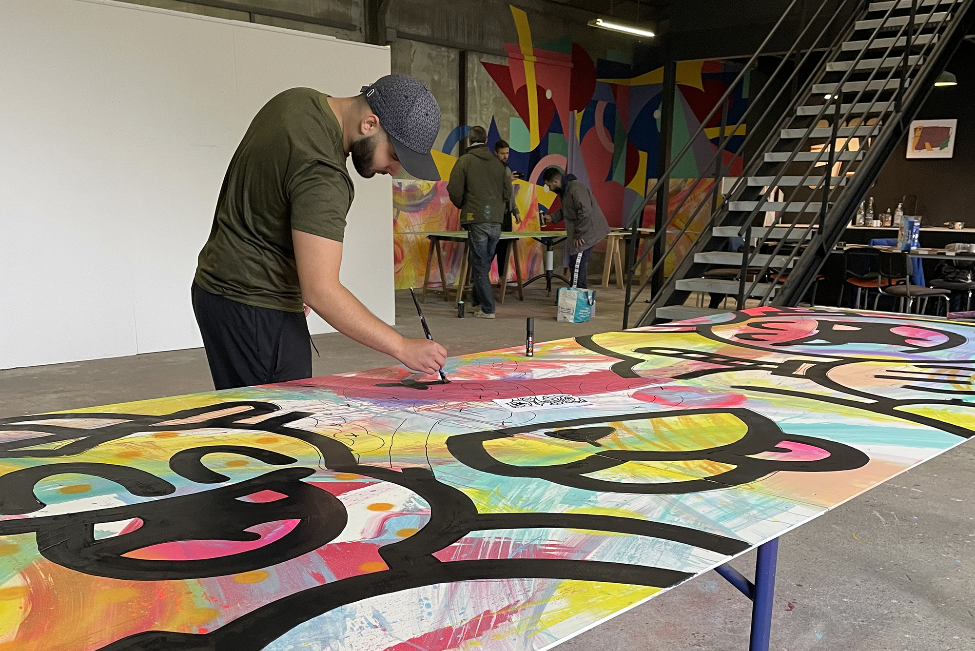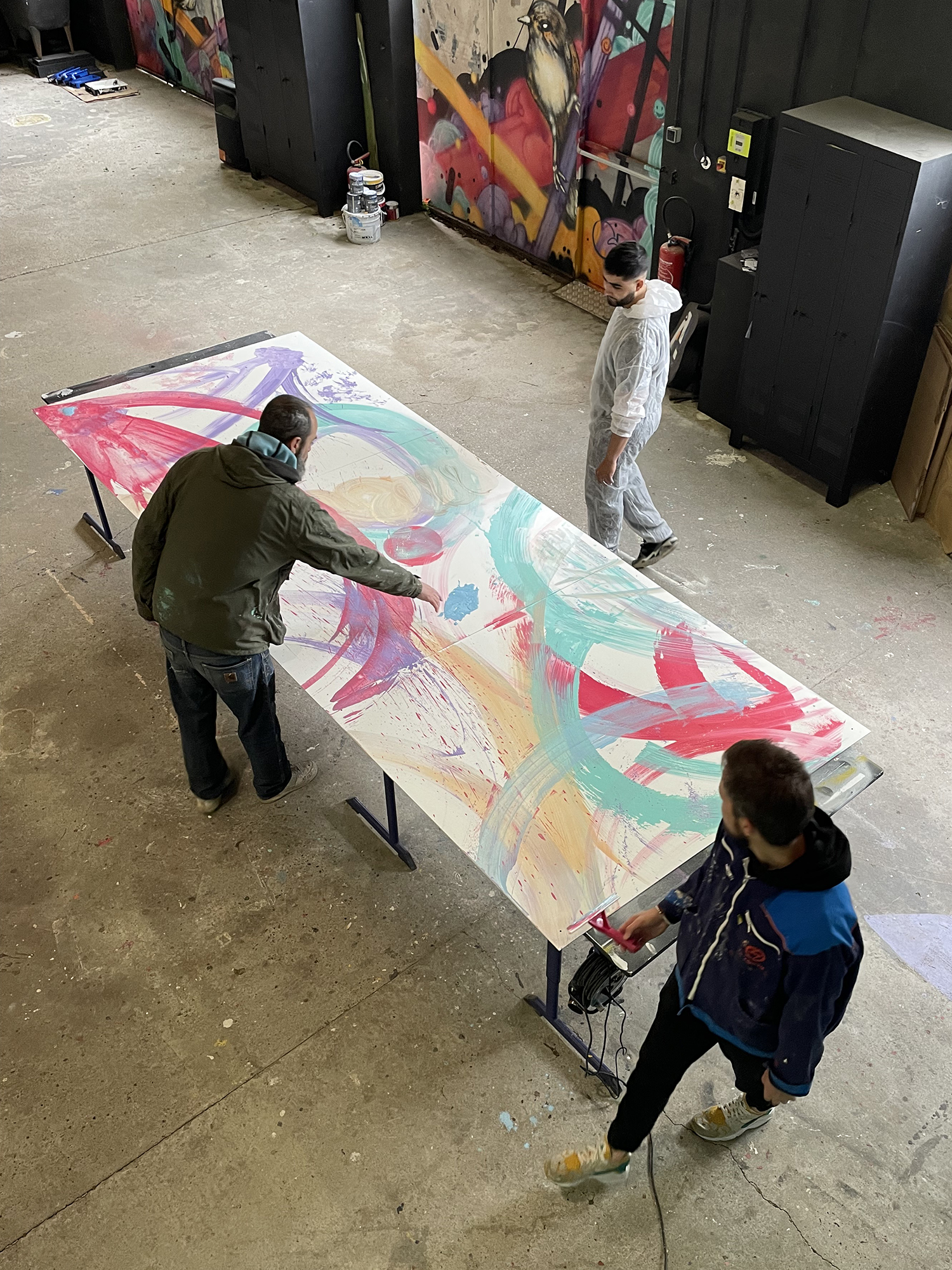3 triptyques - 4m11 x 1m52. Réalisation sur panneaux de réemploi par les jeunes du quartier "les Plantées" accompagnés par la Sauvegarde69