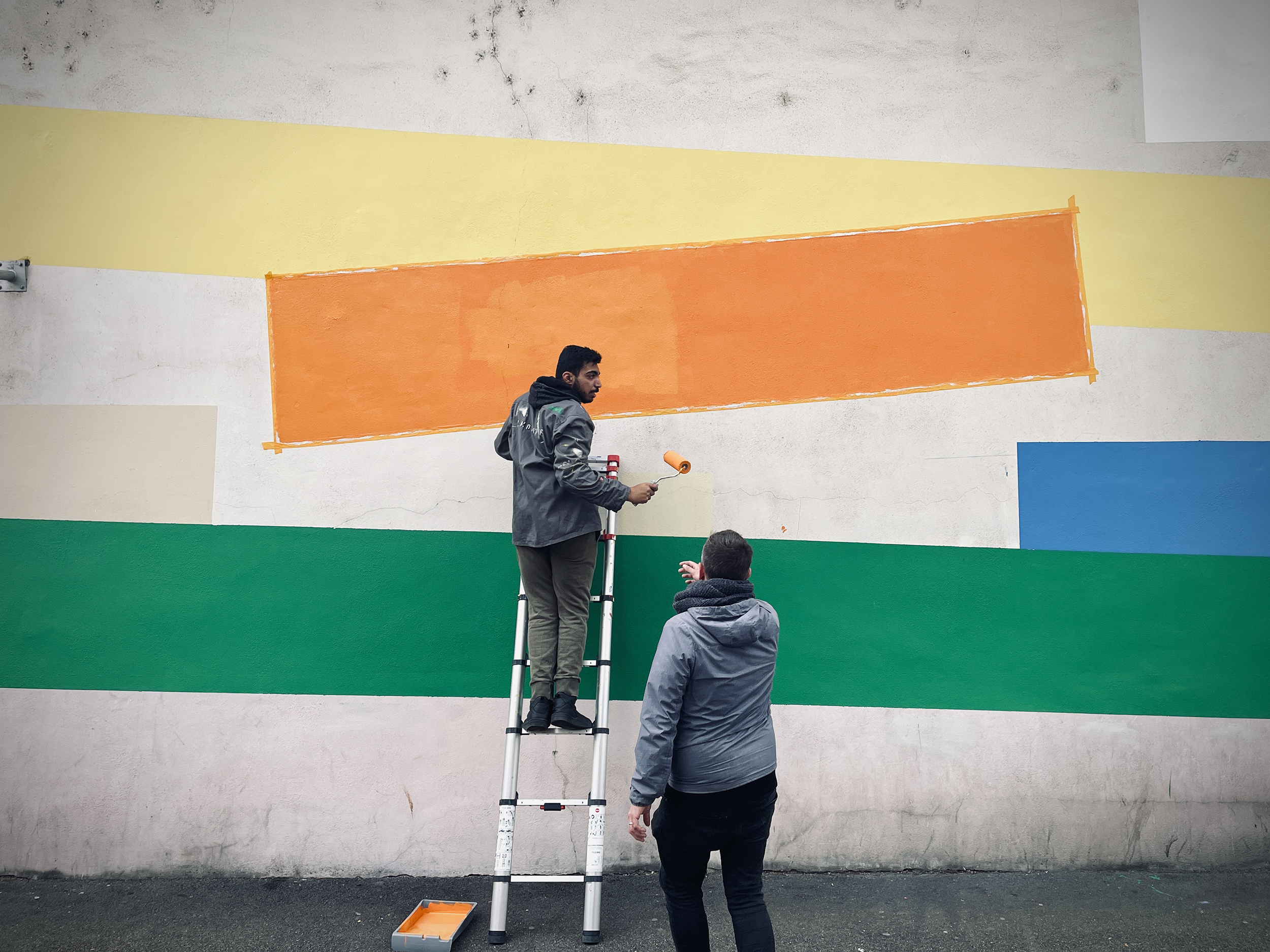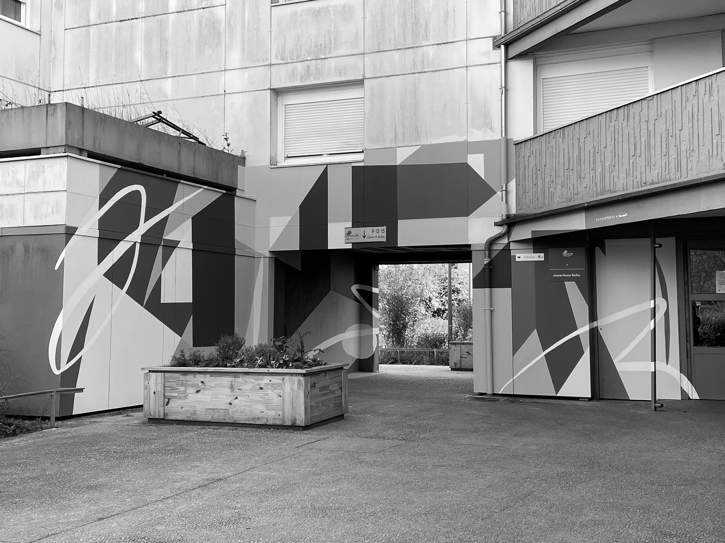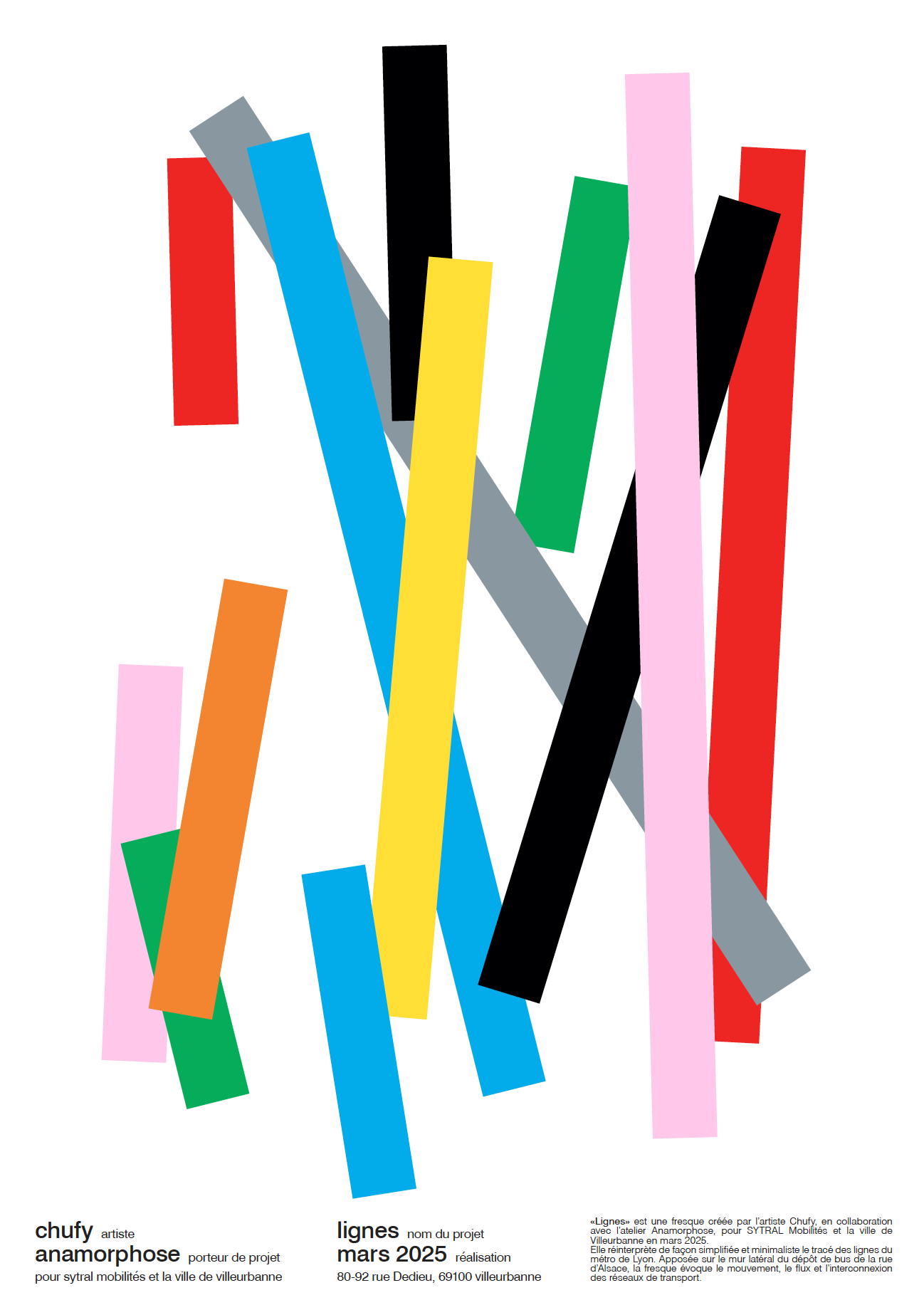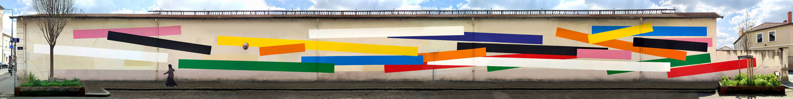 "Lignes" réinterprète de façon minimaliste le tracé des lignes du métro de Lyon. Fresque de 70x6m réalisée avec les résidents Villeurbannais et les jeunes de la Fondation OVE.