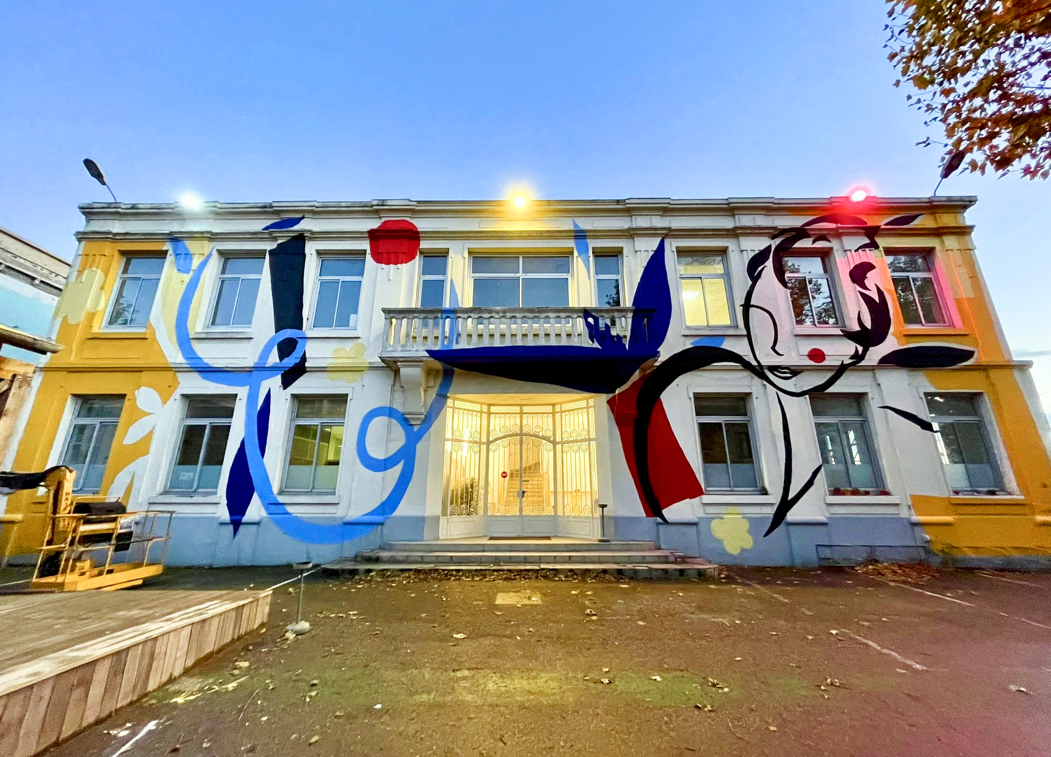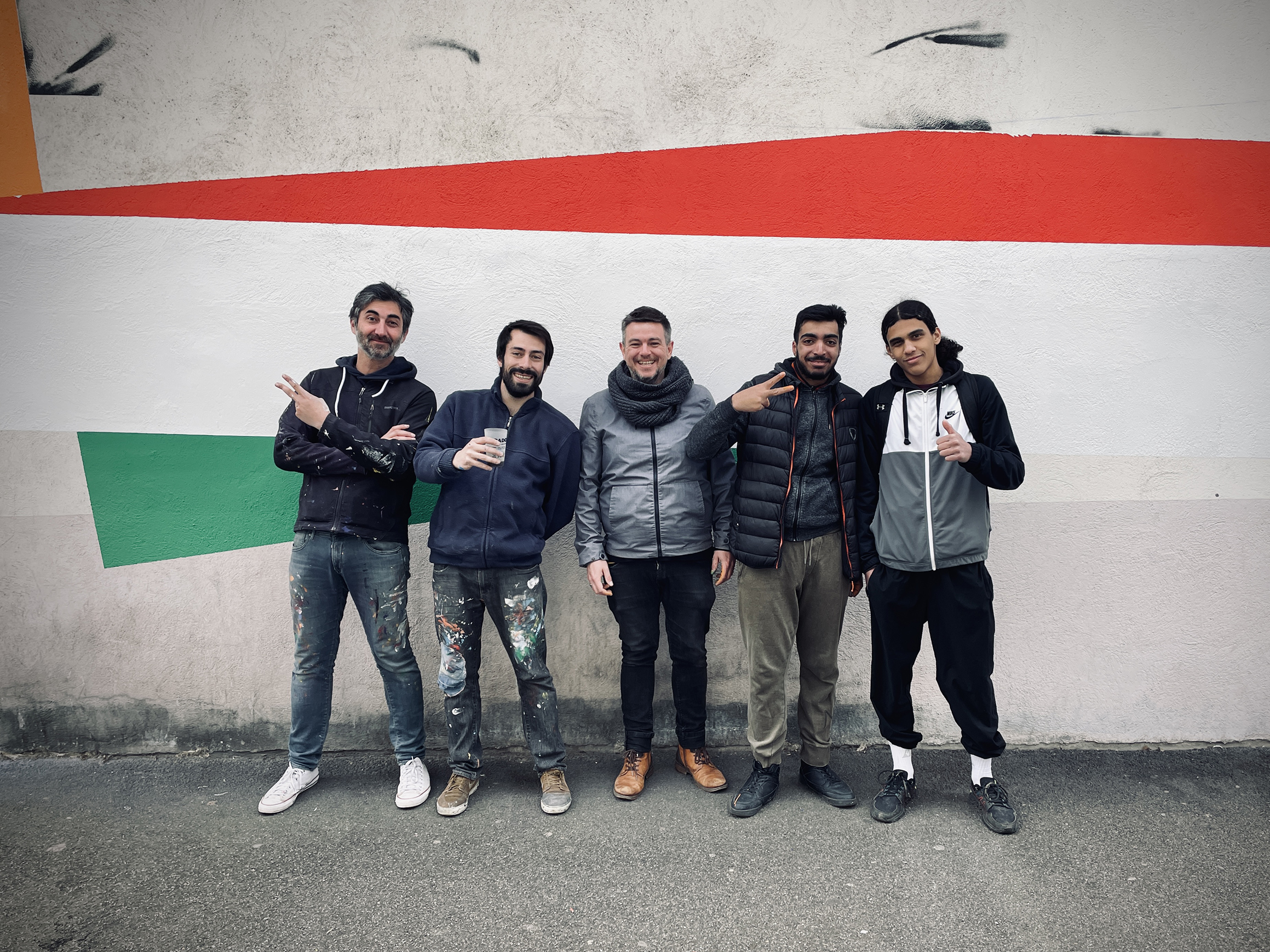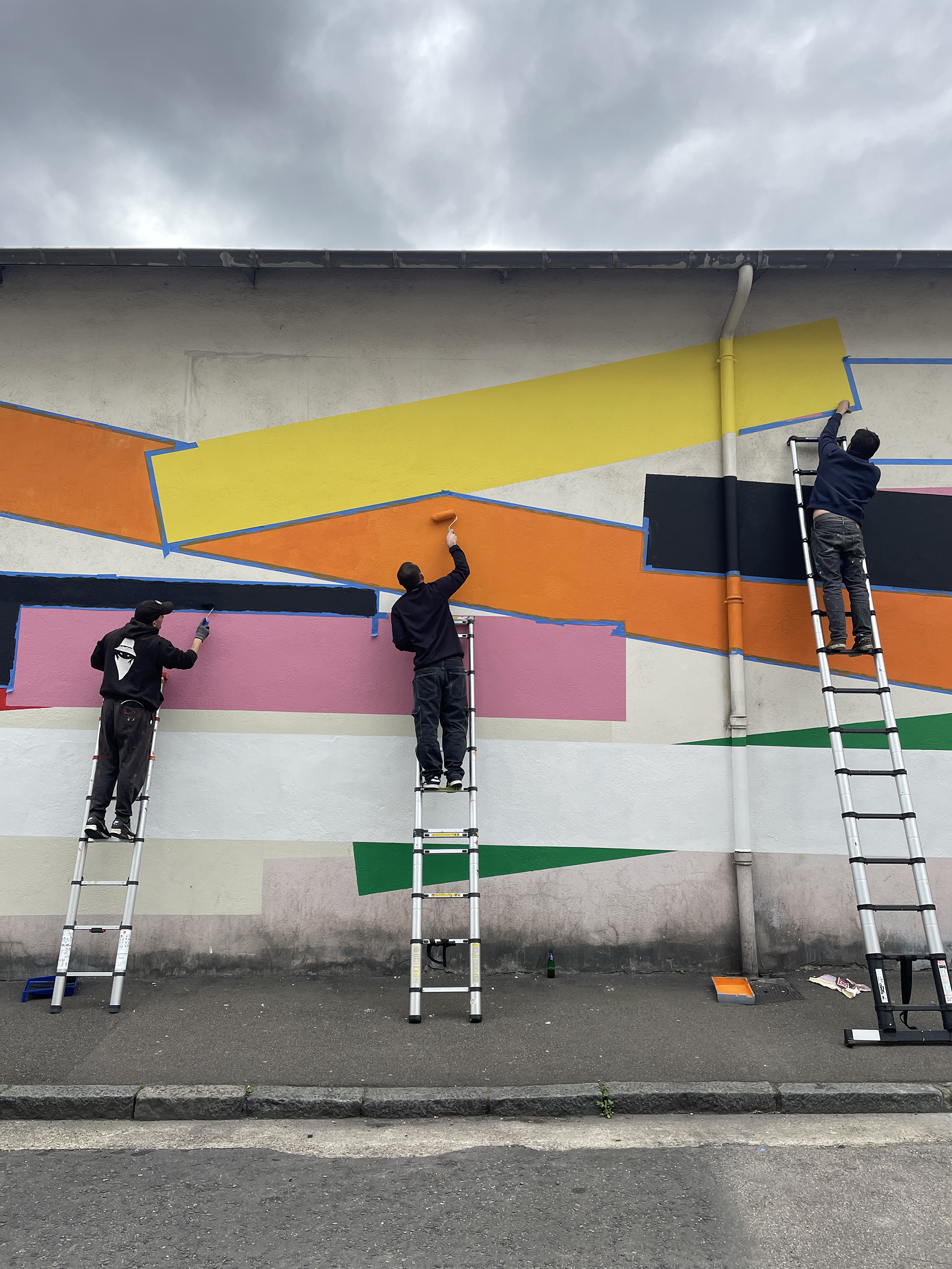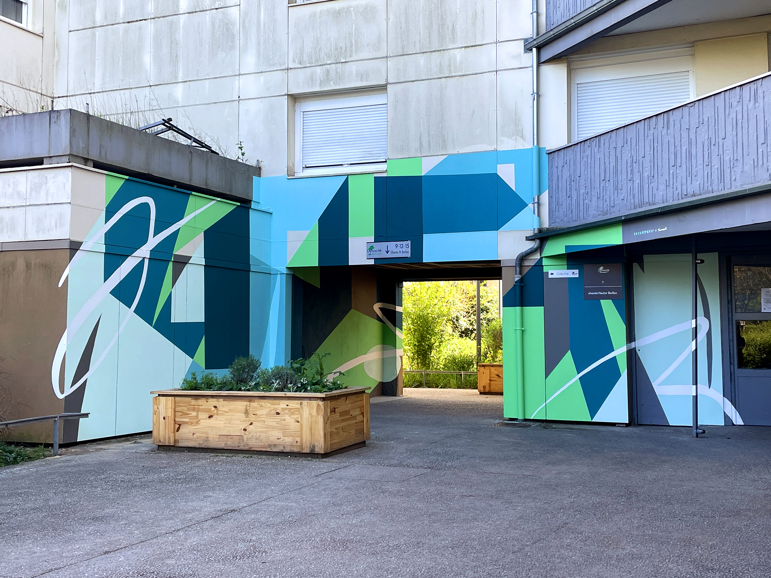 "Lignes" réinterprète de façon minimaliste le tracé des lignes du métro de Lyon. Fresque de 70x6m réalisée avec les résidents Villeurbannais et les jeunes de la Fondation OVE.