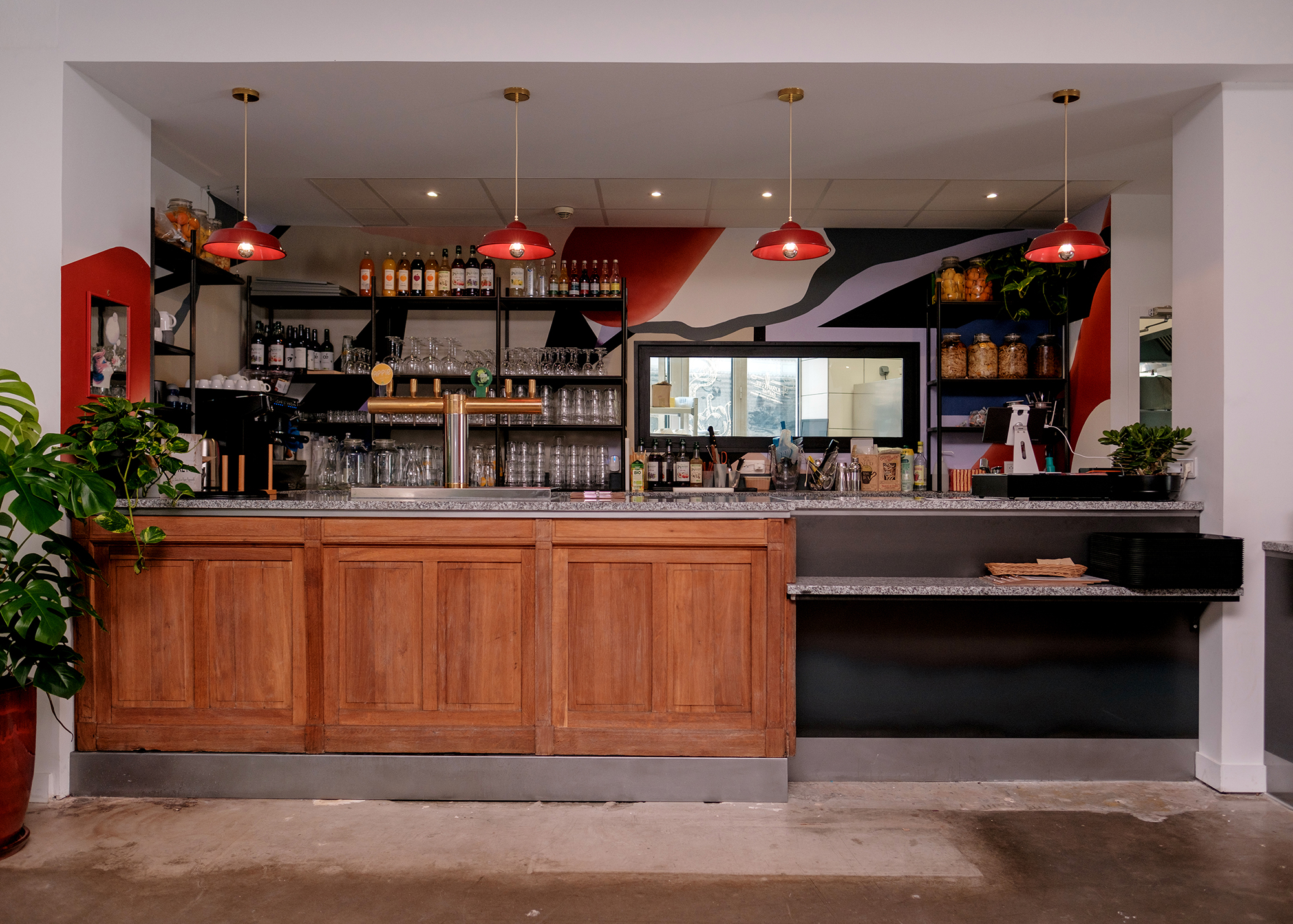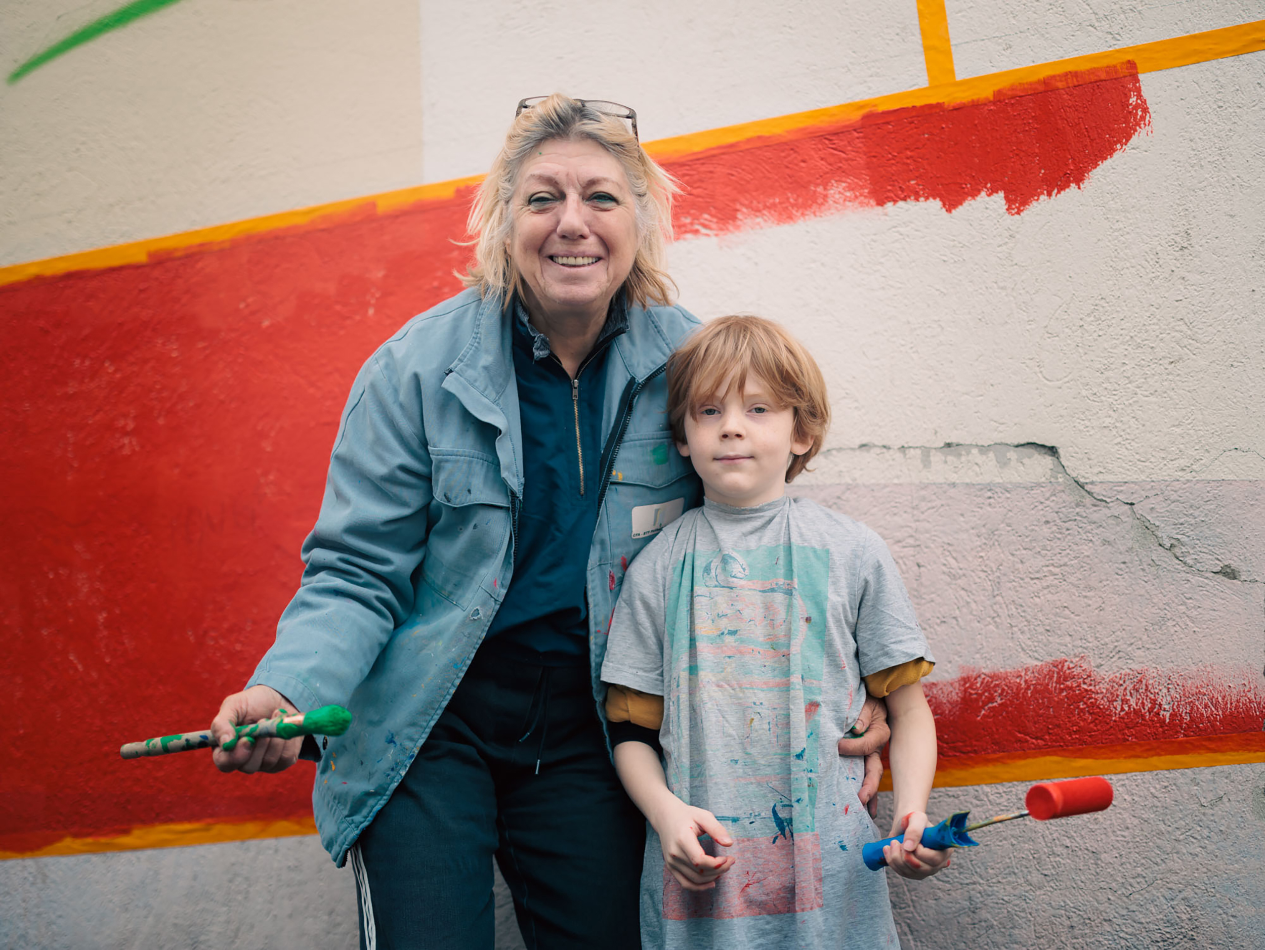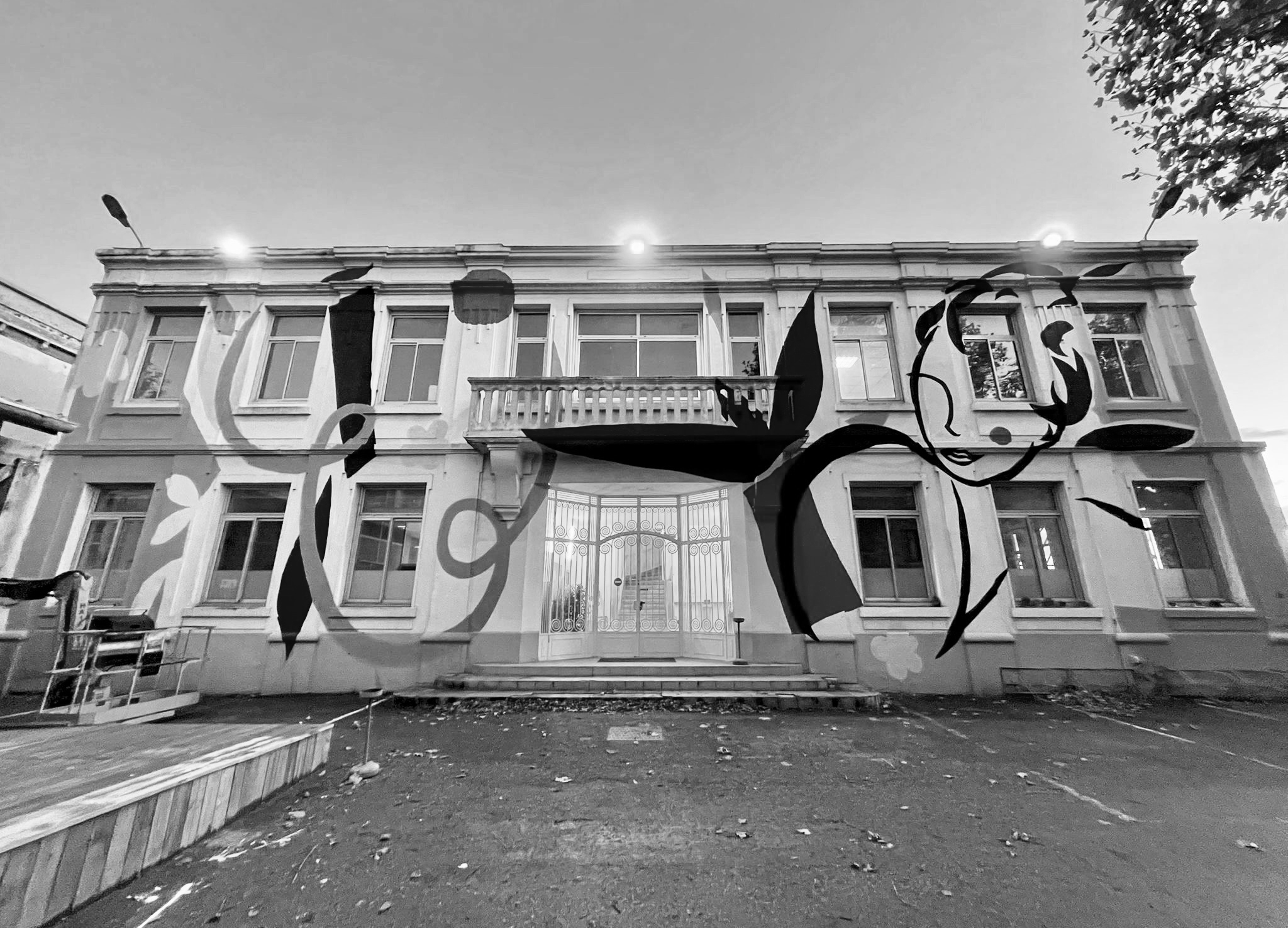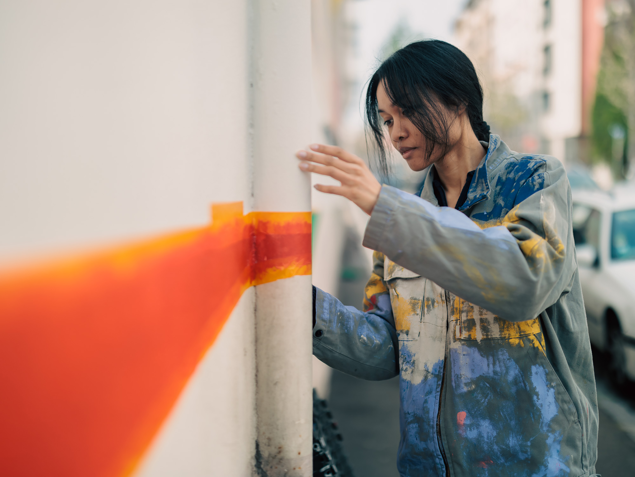 "Lignes" réinterprète de façon minimaliste le tracé des lignes du métro de Lyon. Fresque de 70x6m réalisée avec les résidents Villeurbannais et les jeunes de la Fondation OVE.