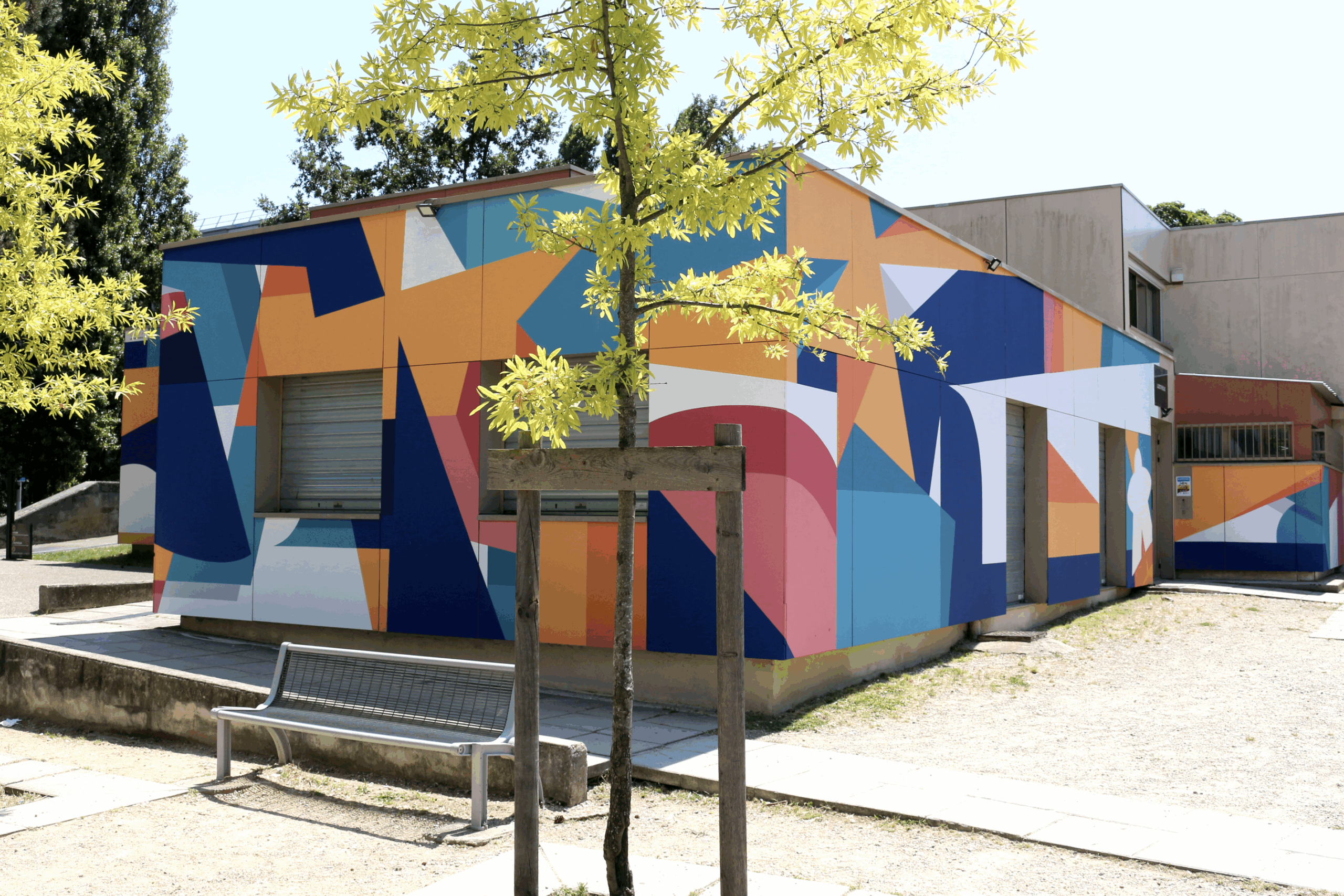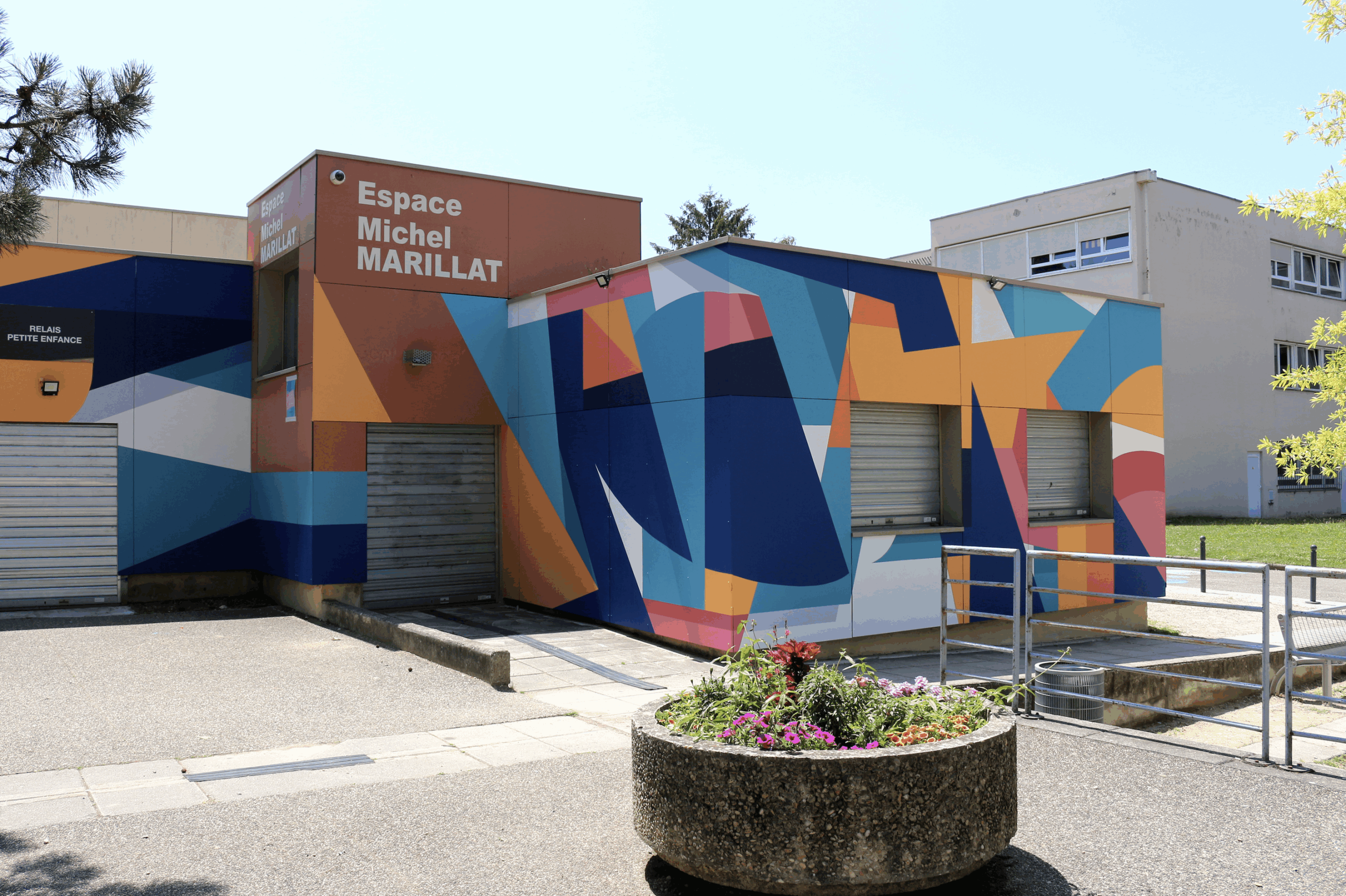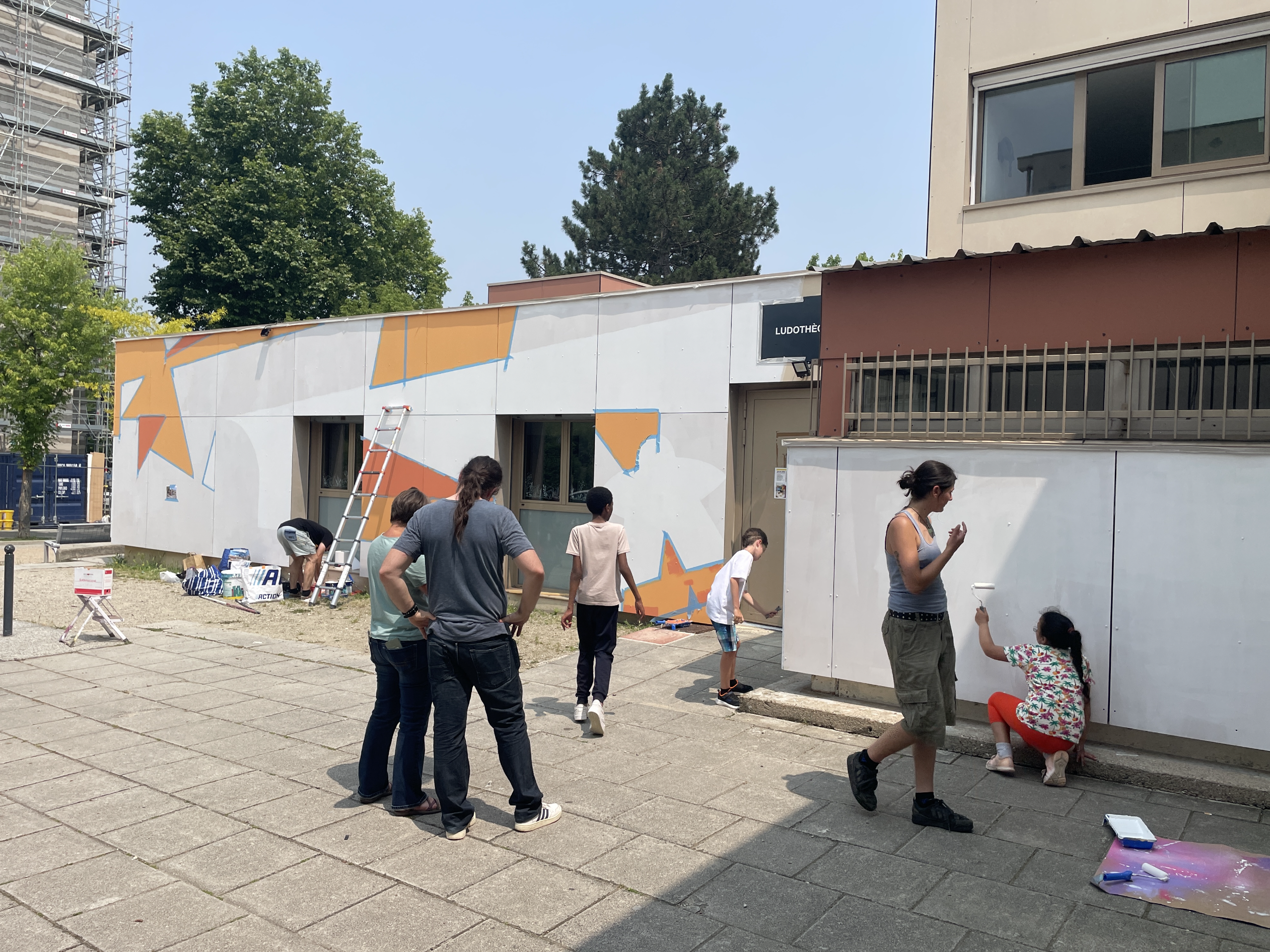 Fresque réalisée avec la participation d'une 30aine d'habitants : les adhérentes de la ludothèque, jeunes de l’espace Prainet, jeunes du collège, les jeunes de l’IME les Marguerites et l'IME oiseau blanc.