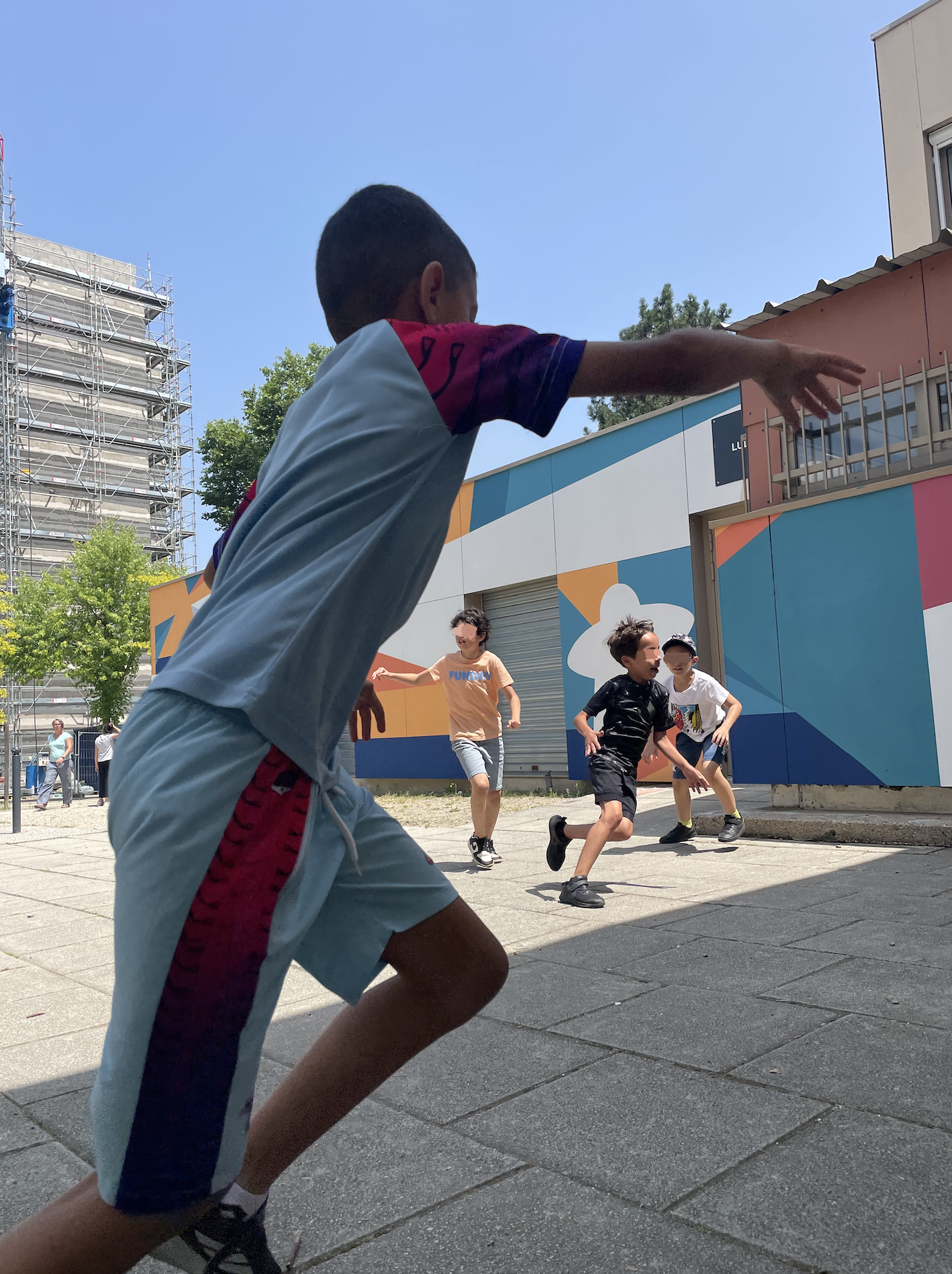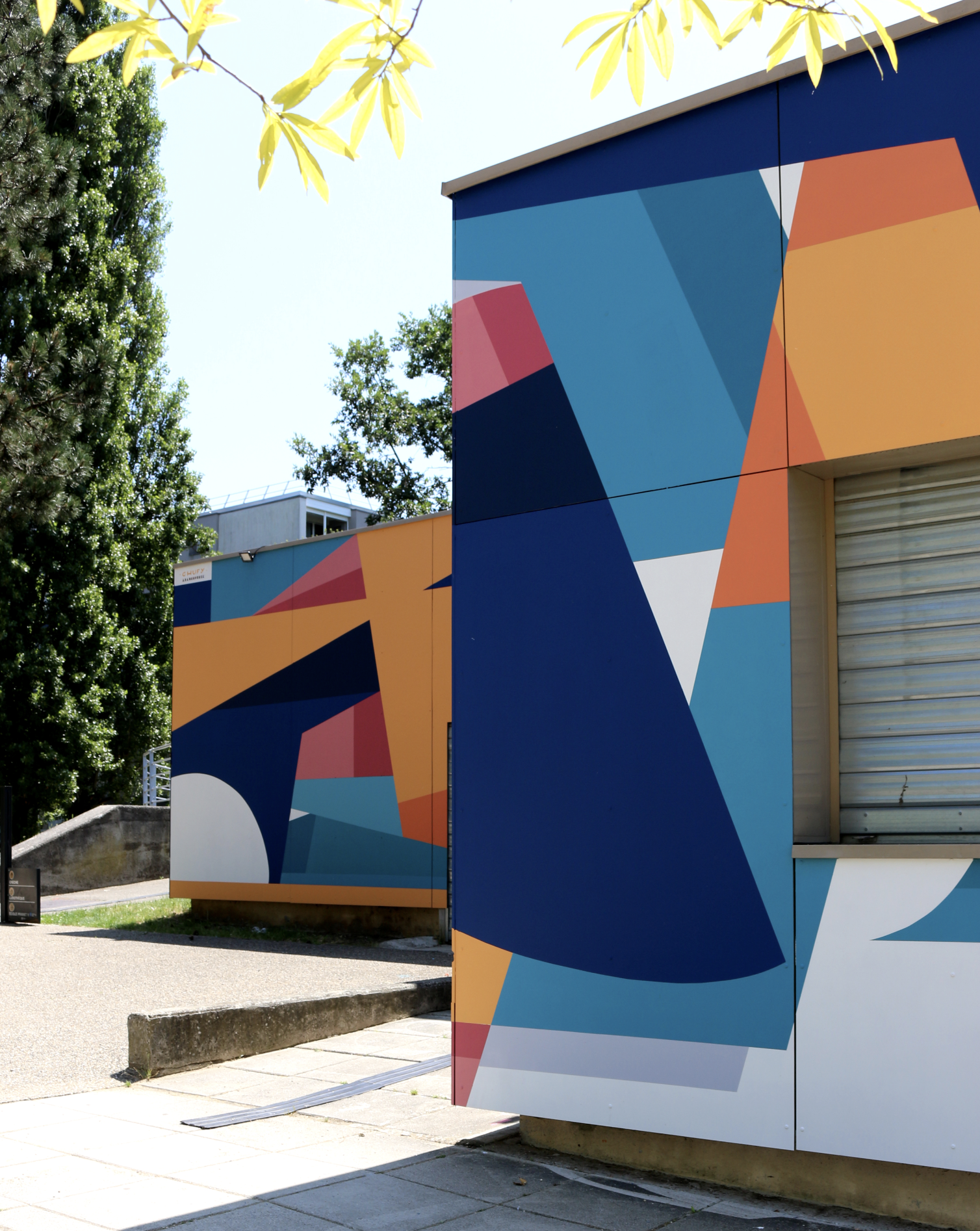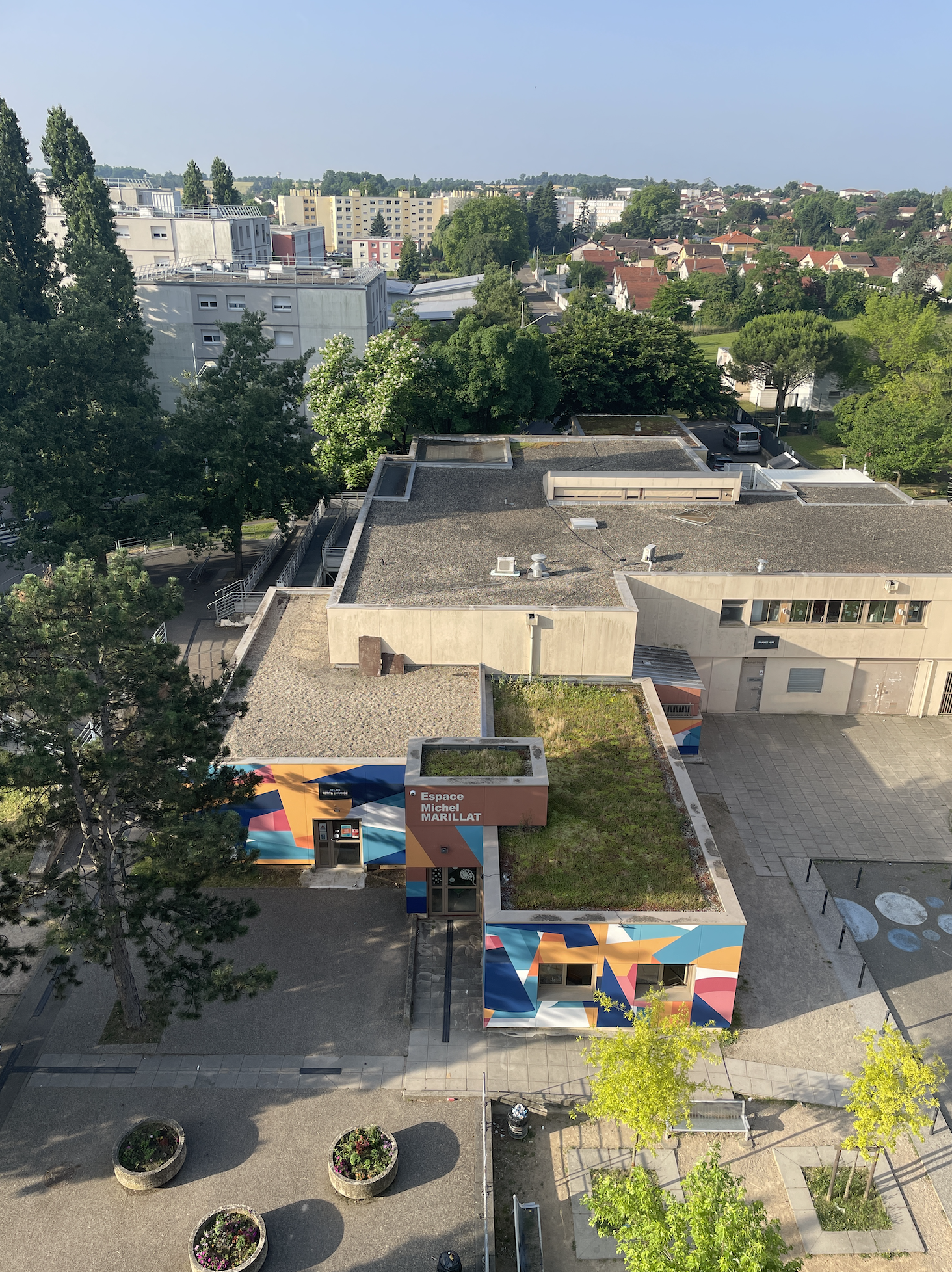 Fresque réalisée avec la participation d'une 30aine d'habitants : les adhérentes de la ludothèque, jeunes de l’espace Prainet, jeunes du collège, les jeunes de l’IME les Marguerites et l'IME oiseau blanc.