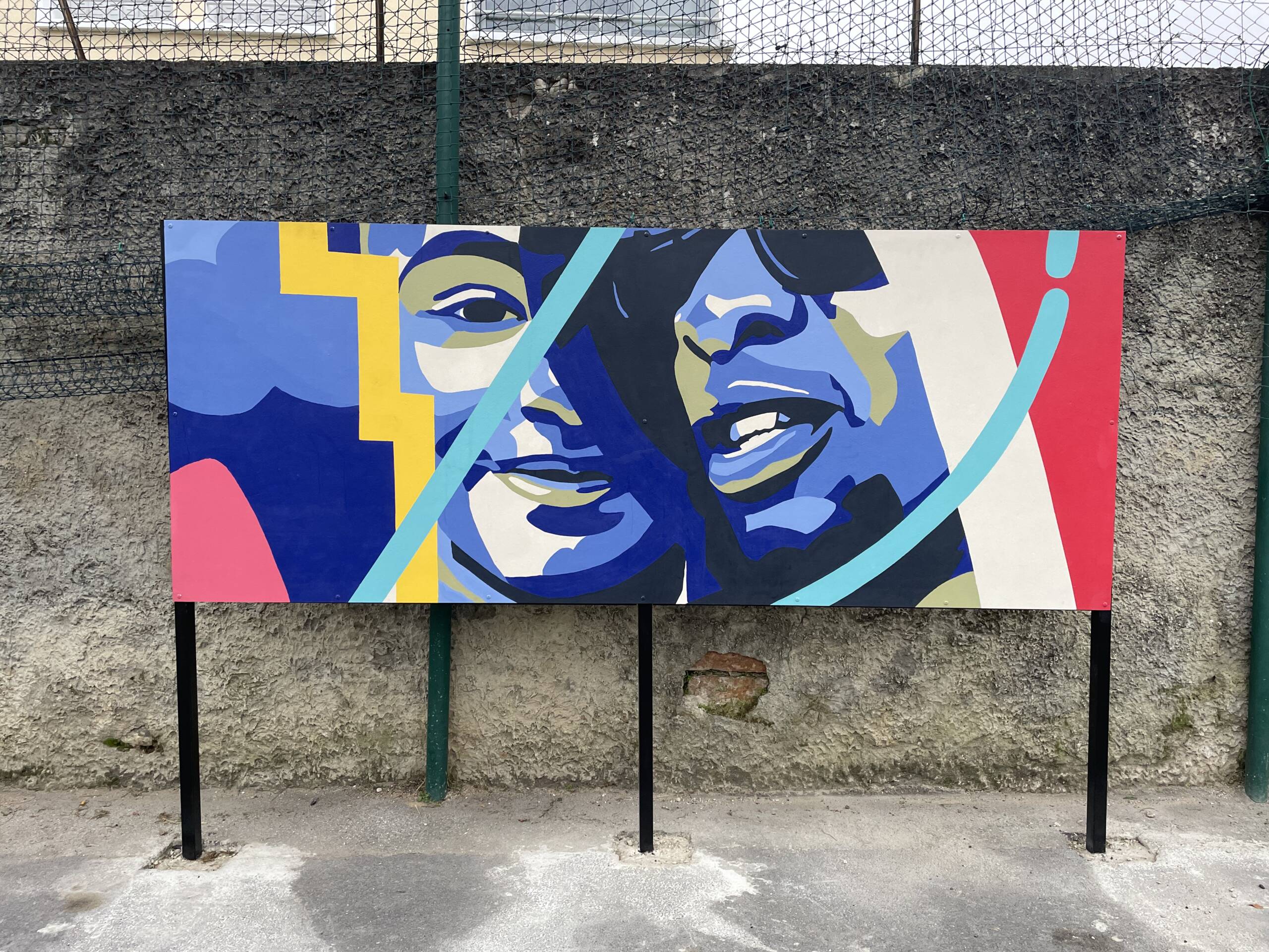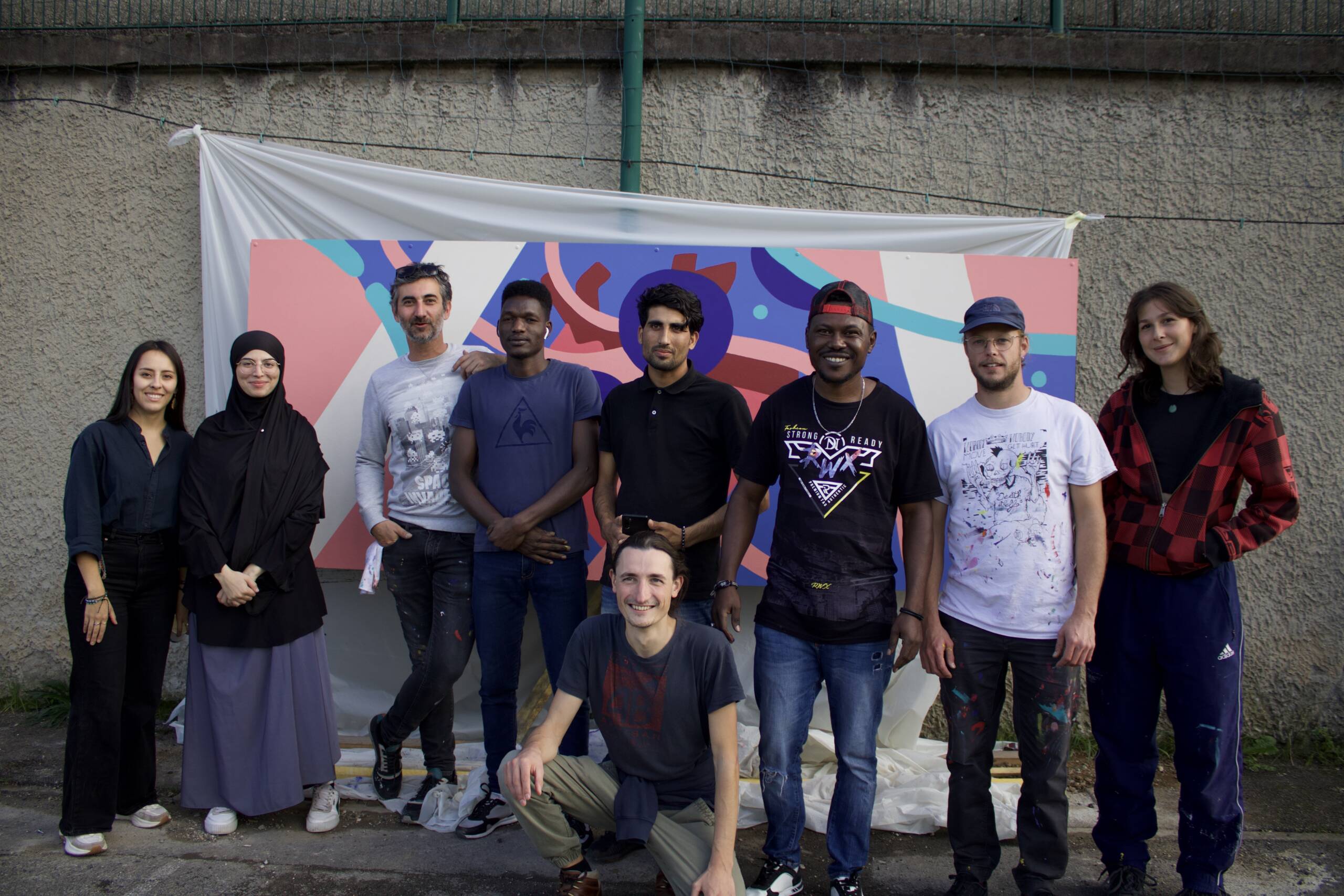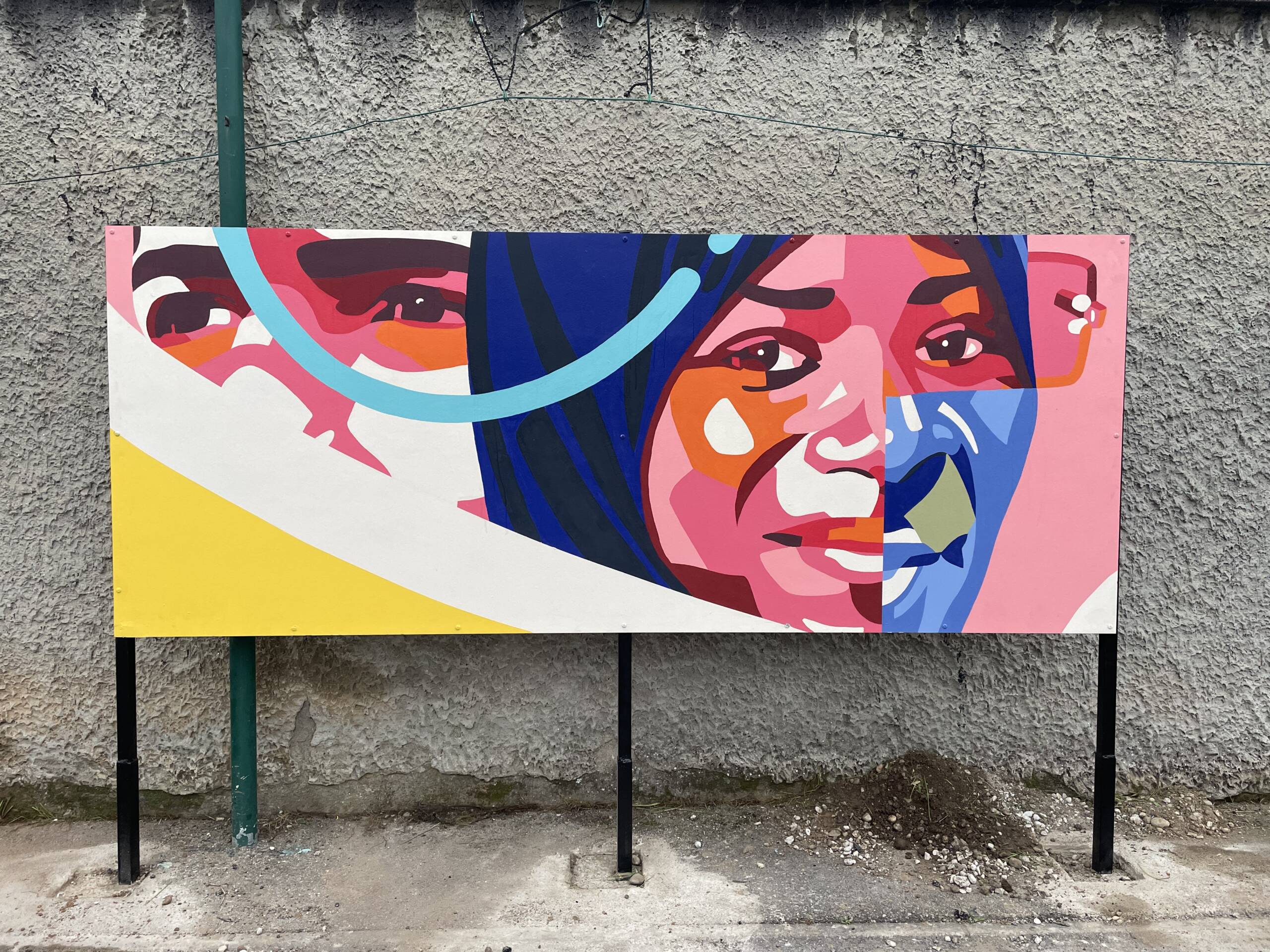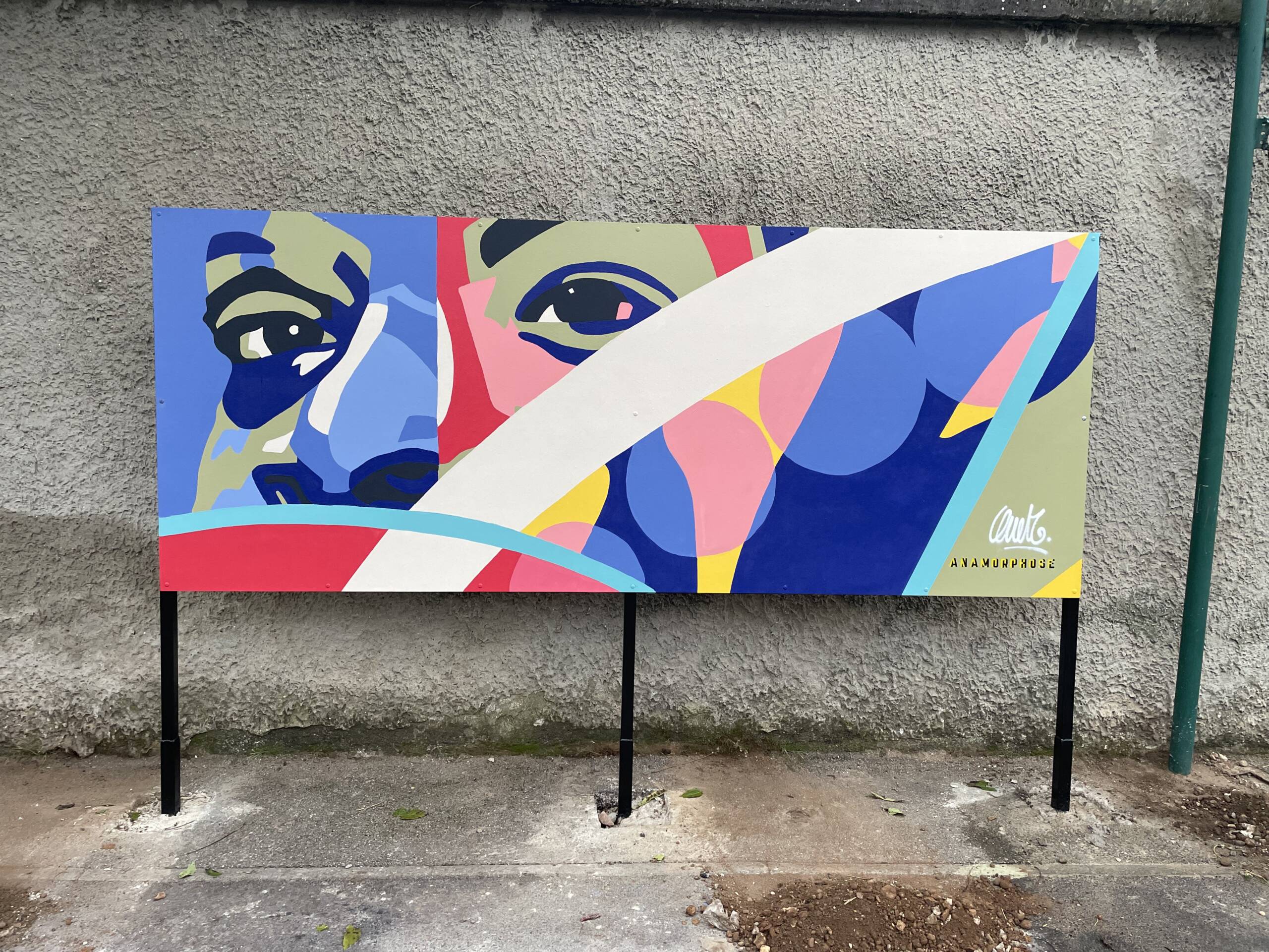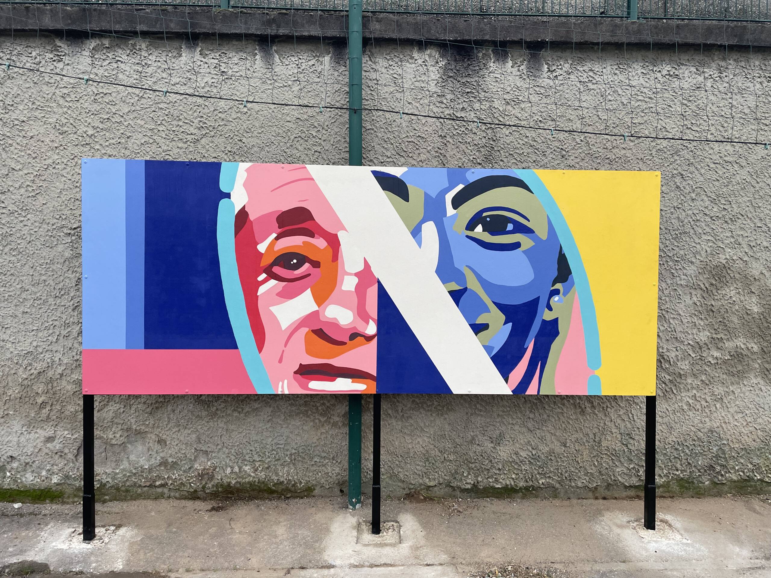 8 panneaux réalisés par une 20aine de bénéficiaires : Forum réfugiés, Centre Social Gisèle Halimi & Sauvegarde69, représentant des portraits des résidents du quartier.