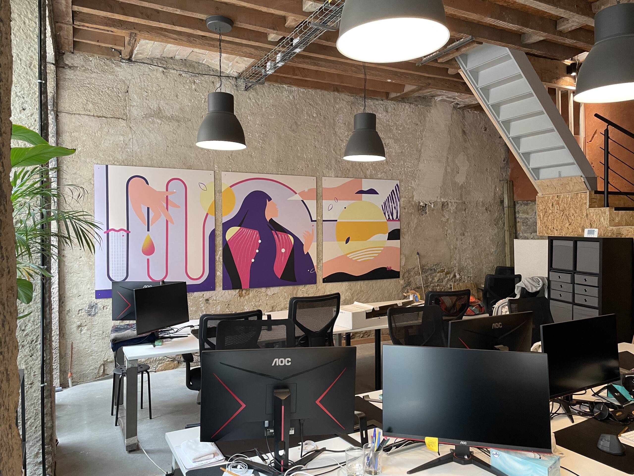 Triptyque sur table de ping-pong de réemploi pour embellir les espaces de travail partagés. Réalisé par les jeunes de la Fondation OVE